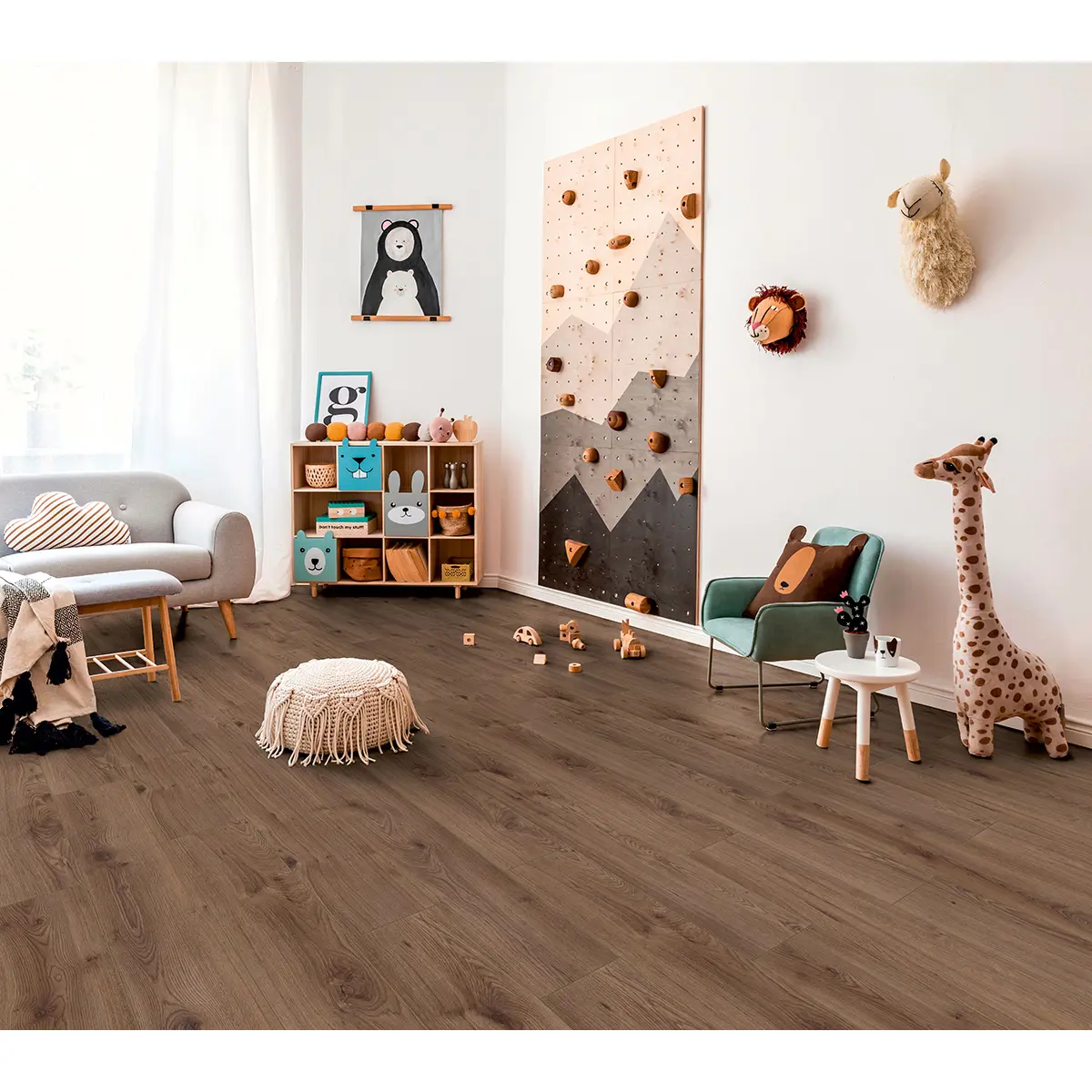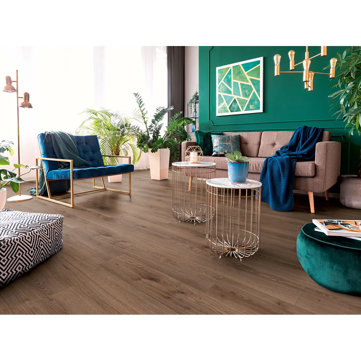 Laminatgolv Kronotex Glamour Virginia Oak 1-Stav. Ett mörkt laminatgolv från Kronotex i 1-stavsutförande. Med sin välomtyckta design av skeppsdeck får du ett golv med både klass och stil. Tack vare den klassiska ekimitationen med mörkbruna nyanser får du en känsla av lyx, utöver det har plankan en 4-sidig v-fasning. Kronotex Glamour-serien kommer även med det välkända patenterade låssystemet 5G som gör golvet snabbt, lätt och roligt att lägga.