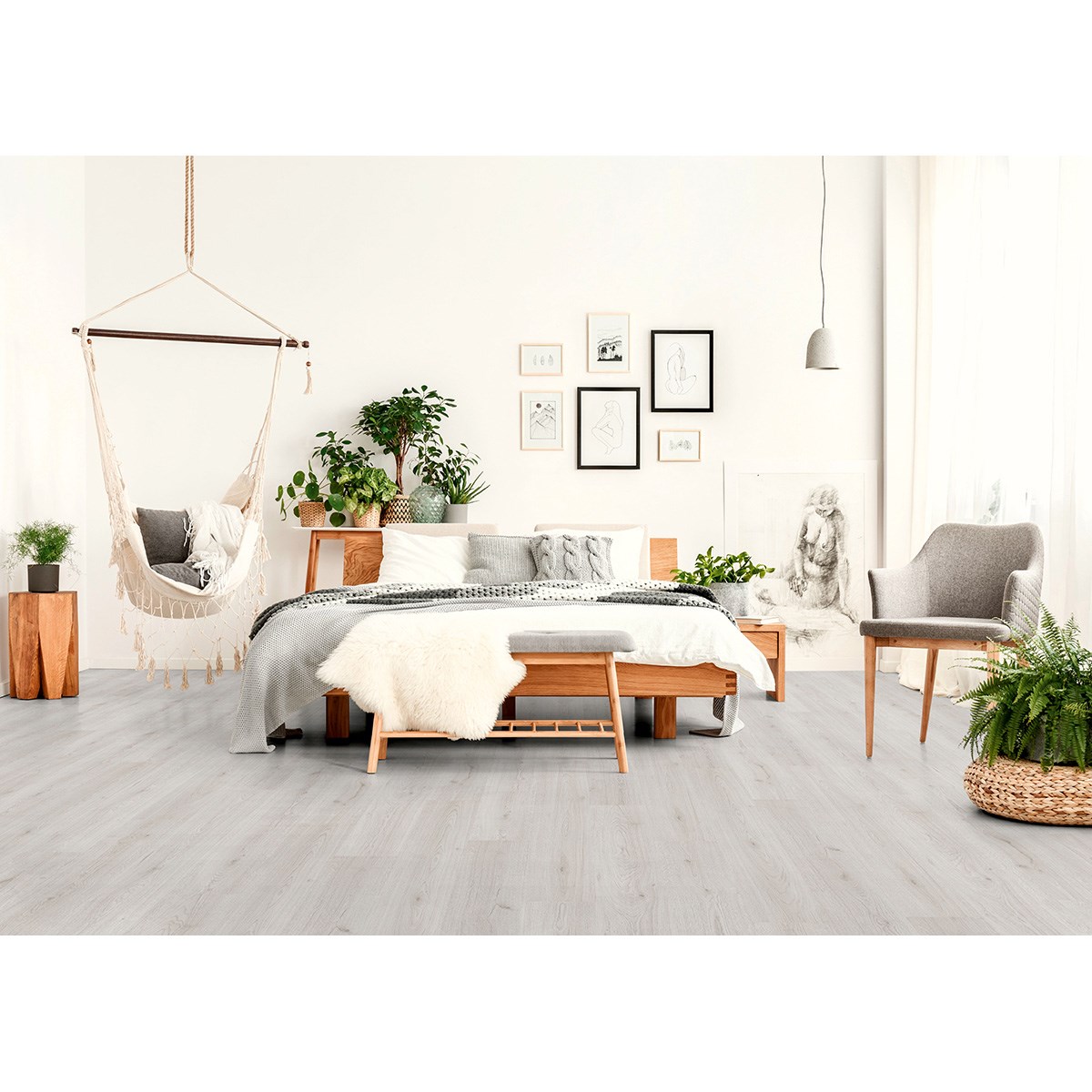 Laminatgolv Kronotex Superior Advanced Trend Oak White 1-Stav. Ett oskyldigt ljust laminatgolv från Kronotex i 1-stavs utförande. Med sina dova nyanser ger det mycket ljus i rummet som återspeglar sig så väl på väggen som på övriga inredningen. Kombinera gärna med en mörkare inredning för att skapa harmoni. Kronotex kommer även med det välkända patenterade låssystemet 5G som gör golvet snabbt, lätt och roligt att lägga.