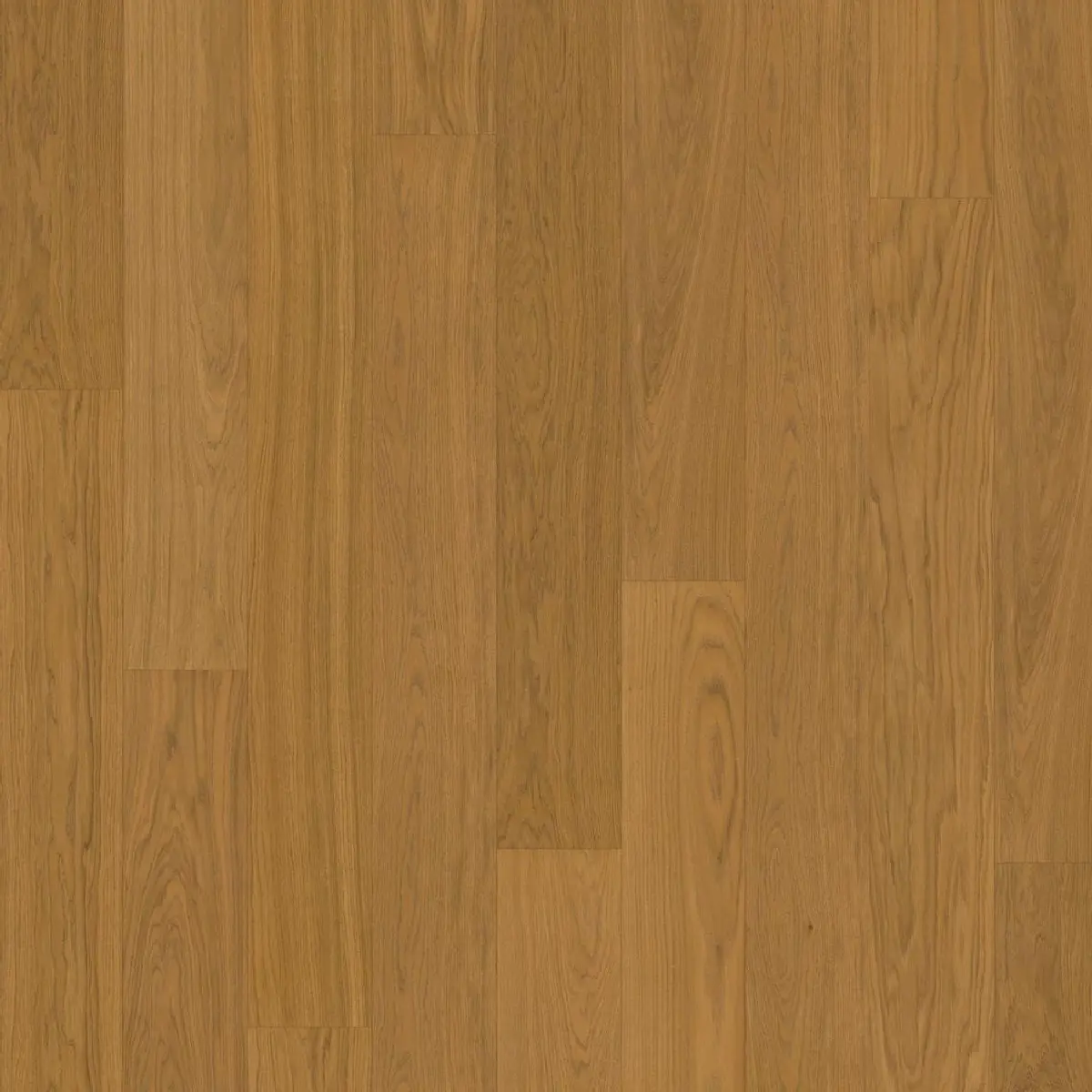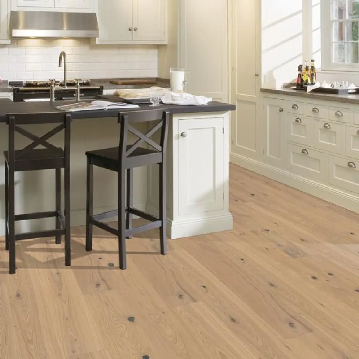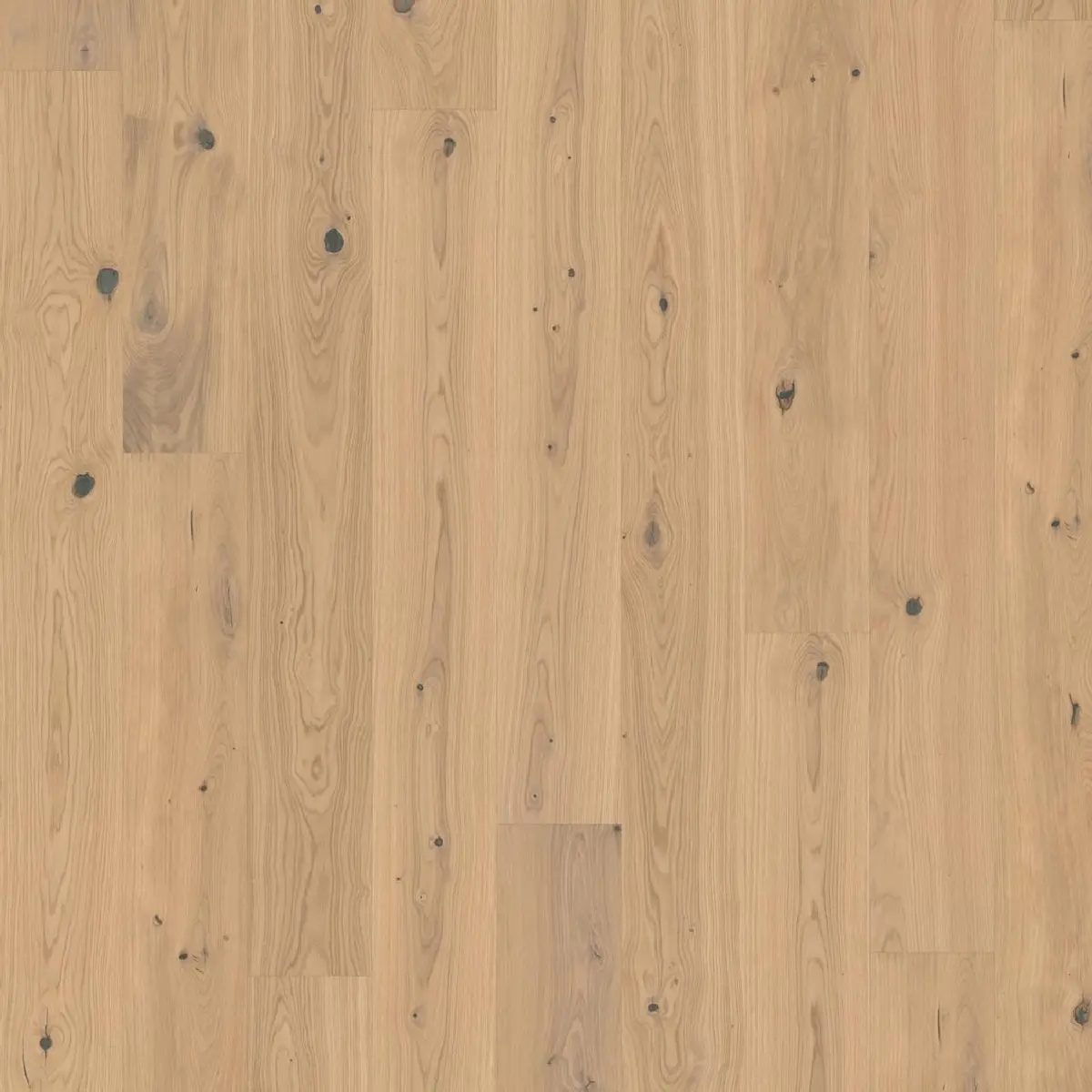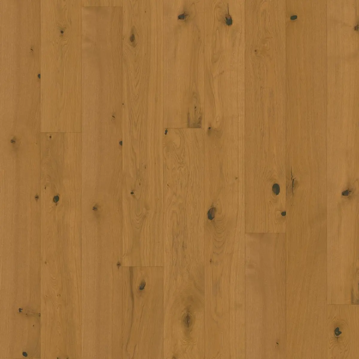 Ek Turmeric, ett ljust trägolv med en färg inspirerad av gurkmejans ljusa och varma toner som skapar en rustik charm med en högre förekomst av naturliga kvistar. Den organiska texturen tillför karaktär och gör varje planka unik, samtidigt som det ger en mysig, men ändå lätt känsla till alla rum.