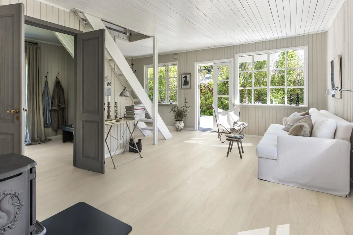 Fanérgolv Kährs Life Coconut Cream 1-Stav har en varm, krämig ljus färgsättning med breda plankor och en fyrsidig mikrofas för att ytterligare lyfta fram träets naturlig skönhet. Golvet är mattlackat vilket hjälper till att eliminera ljusets reflektioner samtidigt som träets skyddas från vardaligt slitage. Plankorna har en jämn färgton med mindre variationer, ett begränsat antal små kvistar kan förekomma.Fördelar med fanérgolv:En flerskiktad konstruktion gör golvet väldigt stabilt och inte lika känsligt mot variationer i luftfuktighetenTunnare än många andra typer av trägolv, kan ofta läggas på befintligt golvBra för miljön genom att det värdefulla ädelträet används sparsamtAlla fanérgolv i Life Kollektionen är tillverkade i tre lager: ytskikt, stomme och baksida. Ytskiktet finns i olika träslag och med olika ytbehandlingar. Till stommen används HDF, en skiva av gårt sammanpressade träfibrer. Under HDF-skivan ligger en baksidesfanér. Dessa tre delar sammanlimmas med värme och tryck för att bilda en hållbar och tålig konstruktion. Den sammanlagda tjockleken är 7 mm. Golven kan läggas både flytande och limmas ned.
