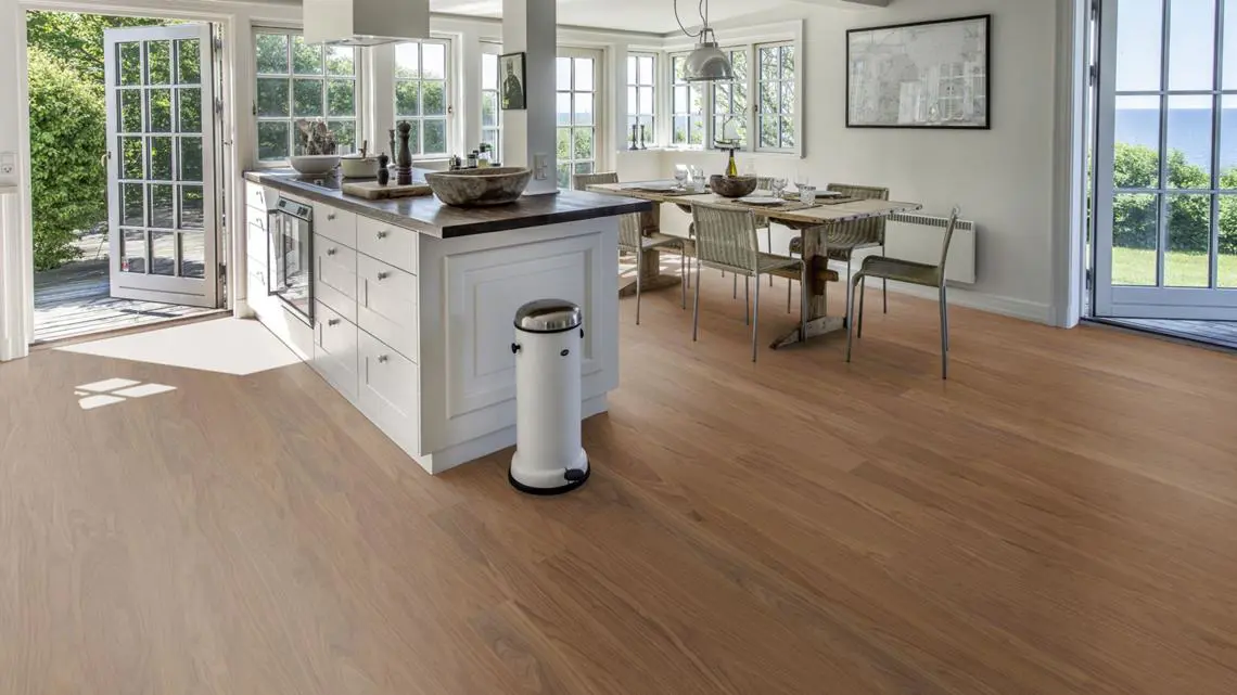 Fanérgolv Kährs Life Pure Walnut 1-Stav är ett elgant valnötsgolv från Life kollektionen. Golvet är mattlackat vilket hjälper till att eliminera ljusets reflektioner samtidigt som träets skyddas från vardaligt slitage och den 4-sidiga mikrofasen lyfter fram träets naturliga skönhet. Plankorna har en jämn färgton med mindre variationer, ett begränsat antal små kvistar kan förekomma.Fördelar med fanérgolv:En flerskiktad konstruktion gör golvet väldigt stabilt och inte lika känsligt mot variationer i luftfuktighetenTunnare än många andra typer av trägolv, kan ofta läggas på befintligt golvBra för miljön genom att det värdefulla ädelträet används sparsamtAlla fanérgolv i Life Kollektionen är tillverkade i tre lager: ytskikt, stomme och baksida. Ytskiktet finns i olika träslag och med olika ytbehandlingar. Till stommen används HDF, en skiva av gårt sammanpressade träfibrer. Under HDF-skivan ligger en baksidesfanér. Dessa tre delar sammanlimmas med värme och tryck för att bilda en hållbar och tålig konstruktion. Den sammanlagda tjockleken är 7 mm. Golven kan läggas både flytande och limmas ned.