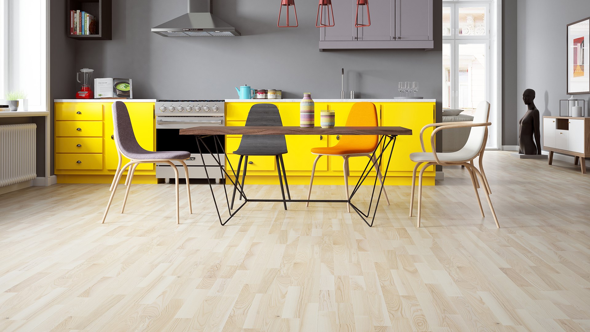 Parkettgolv Decor Milkshake Molti Ask, 3-stav, Mattlack. Ett askgolv i ljus nyans i 3-stavs utförande. Behandlat med mattlack i mjölkvit färg. Laseringen mildrar naturliga kontraster utan att beröva golvet dess karaktär. Mindre kvistar får förekomma på ytan. Vid montering används klicksystemet 5GC som gör det smidigt, roligt och snabbt att lägga.