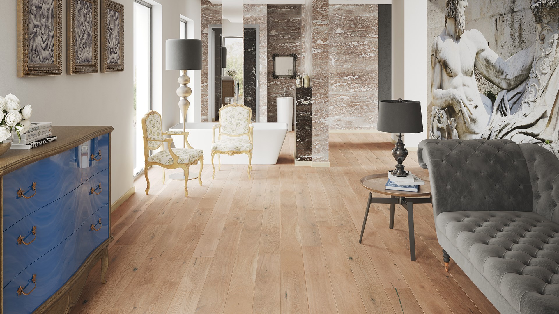 Parkettgolv Tastes Of Life Banana Song Grande Ek, 1-stav, Mattlack. Ett elegant ljust ekgolv med 1-stav/plank utförande. Med en mycket rik och tydlig struktur framhävd genom borstning. Plankkanterna är fyrsidigt fasade och hela ytan är behandlad med mattlack. Vid montering används klicksystemet 5GC som gör det smidigt, roligt och snabbt att lägga.