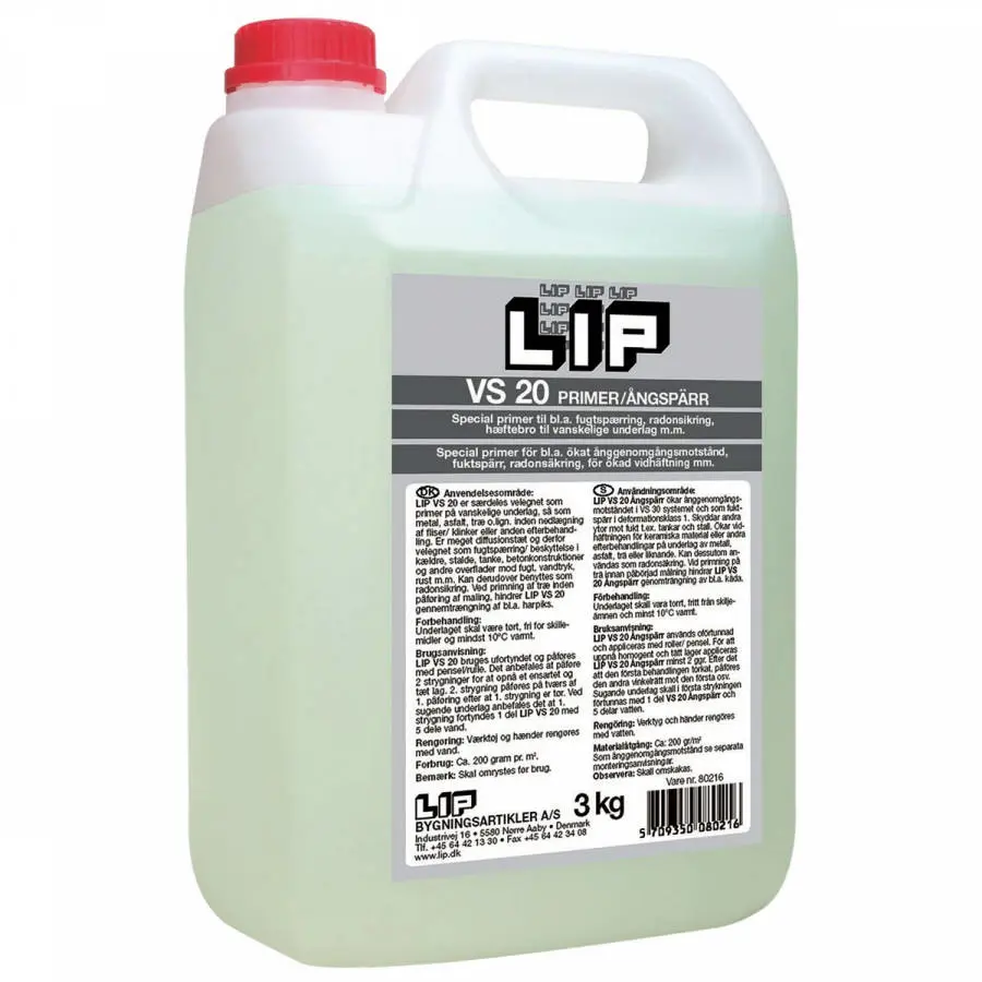 Användningsområde: För intensiv och varaktig fuktbelastning i våtutrymmen på väggar och golv i bostadshus, storkök, industrier osv.före uppsättning av keramiska beklädnader. Kan även användas för att öka vidhäftning mot ex. metall, asfalt. Vid krav som uppfyller BBVs branschregler används LIP VS 30 system 17.UnderlagAnvänds på icke sugande/sugande underlag av betong, lättbetong, puts och skivmaterial som uppfyller kraven i BBVs branschregler för vägg (se www.bkr.se). Sugande underlag primas med förtunnad VS 20: 1 del VS 20 och 5 delar vatten (1:5).MaterialåtgångSe monteringsanvisning för respektive system och