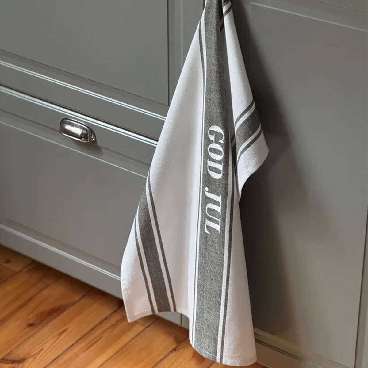 Fina kökshanddukar med broderat God Jul som aldrig går ur tiden. Motivet är broderat på dessa kökshanddukar från Recycled by Wille, som är perfekta till den lantliga inredningen. Handdukarna är tillverkade i 99 procent återvunnet tyg, och för att tillverka en handduk har vi använt tygspill från produktionen av omkring 35 t-shirts. På sätt värnar vi om både människor och miljö, samtidigt som vi skapar fina inredningsdetaljer till ditt hem.