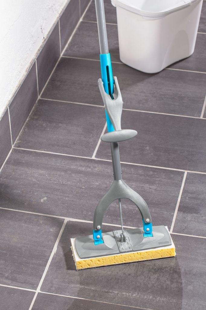 Rengöring: Dra ut teleskopskaftet till önsakd längd. Doppa moppen i en hink och vrid ur med handtaget på skaftet. Dra sen den fuktiga moppen över ytan som ska rengöras.