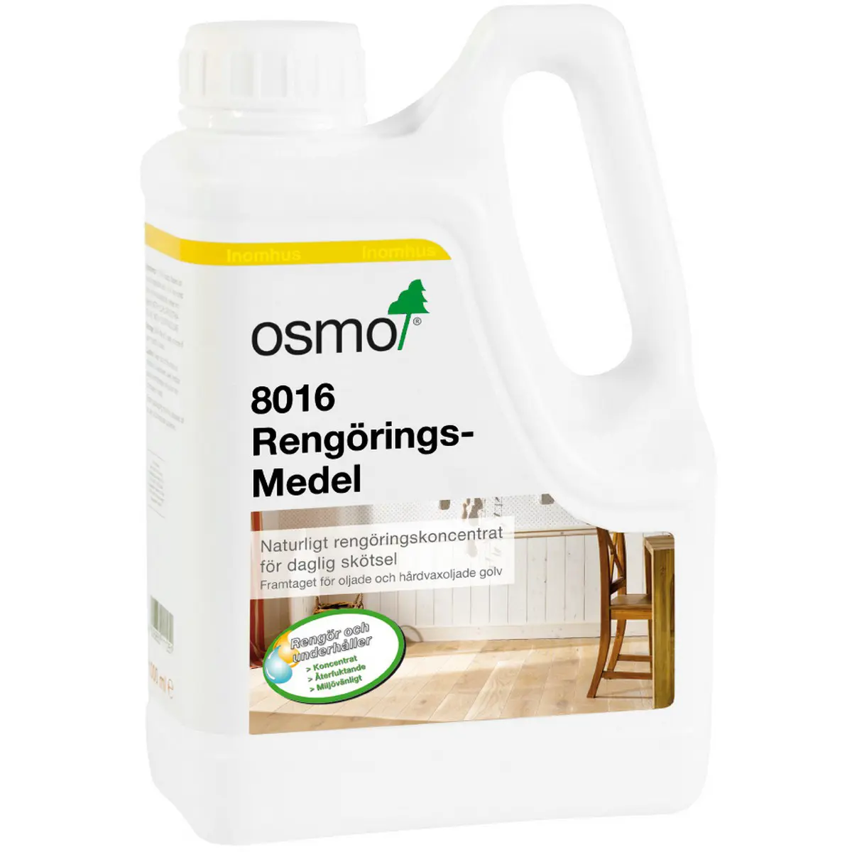 Osmo Rengöringsmedel 8016 1 Liter.Naturligt koncentrat för rengöring av hårdvaxoljade och oljade golv. Innehåller såpa baserad på naturliga oljor, rengör utan att torka ut. Lösningsmedelsfritt och biologiskt nedbrytbart.Naturlig rengöring som inte torkar utOsmo Rengöringsmedel innehåller såpa baserad på naturliga oljor. Den rengör effektivt utan att torka ut eller ta bort olja/hårdvaxolja från träytan, som håller sig fräsch länge. Osmo Rengöringsmedel kan användas för rengöring av Osmo-behandlade golv men även för lackade golv, laminatgolv, klinker, PVC och andra vattenresistenta ytor.Enkelt och fritt från lösningsmedelOsmo Rengöringsmedel är lösningsmedelsfritt och biologiskt nedbrytbart. Blandas med vatten, både rengör och fräschar upp ytan på samma gång. För enkel rengöring av mindre ytor eller ex. bänkskivor och bordsskivor finns även färdigblandade Osmo 8026 Rengöringsspray.