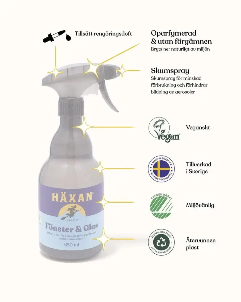 Häxans kur för klarsyn; ger spegelblanka resultat utan ränder Häxan Fönster & Glas skummar och gör dina glasytor och speglar strålande rena utan att rinna eller lämna ränder. Passar utmärkt till: fönster, duschdörrar, speglar, glasbord, kakel, bänkskivor, kylskåp och andra blanka ytor. Välj och addera en doft till denna produkt för att ta det till nästa nivå.