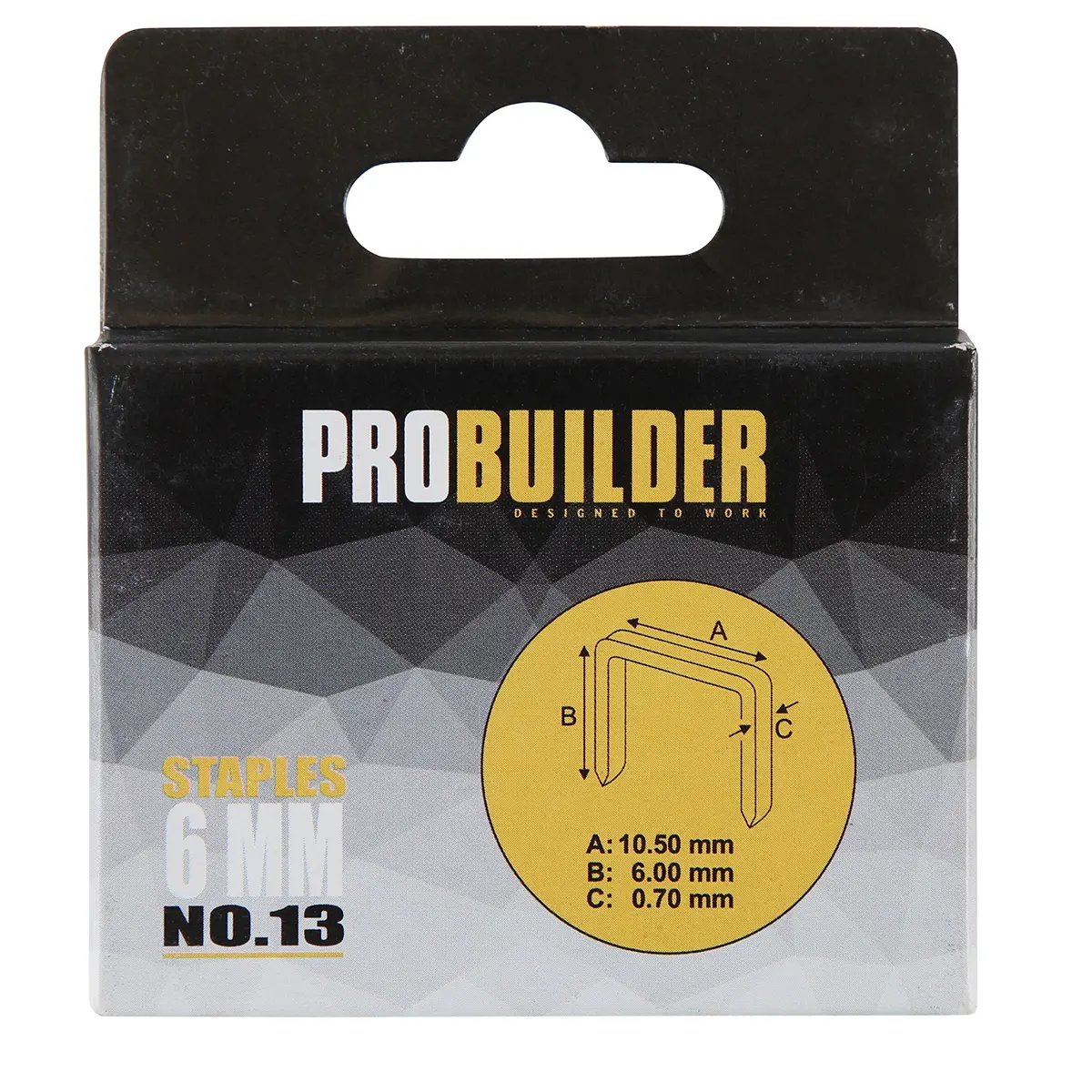 Högkvalitativa galvaniserade häftklamrar i storlek No. 13 (6 mm) – perfekta för både inomhus- och utomhusbruk. Levereras i en praktisk förpackning med 1000 stycken.