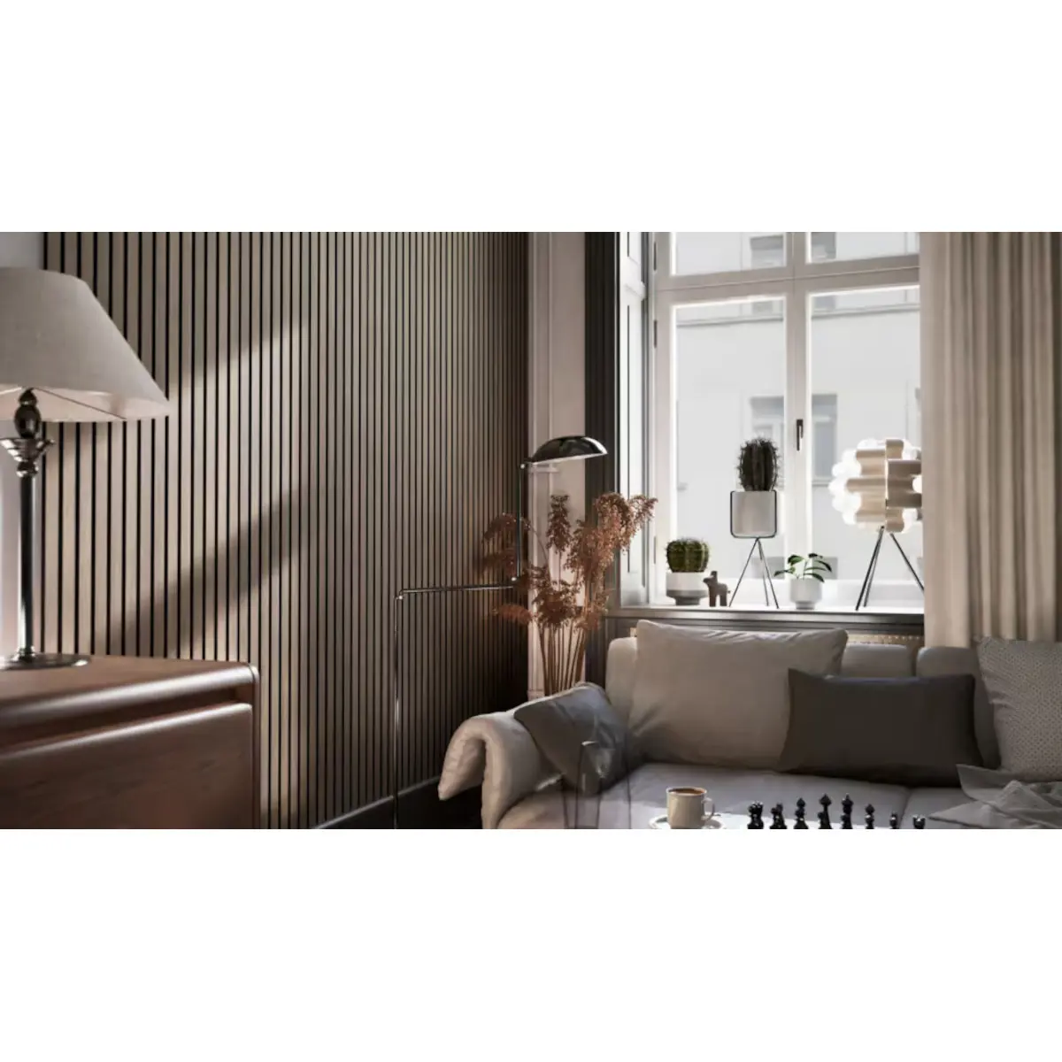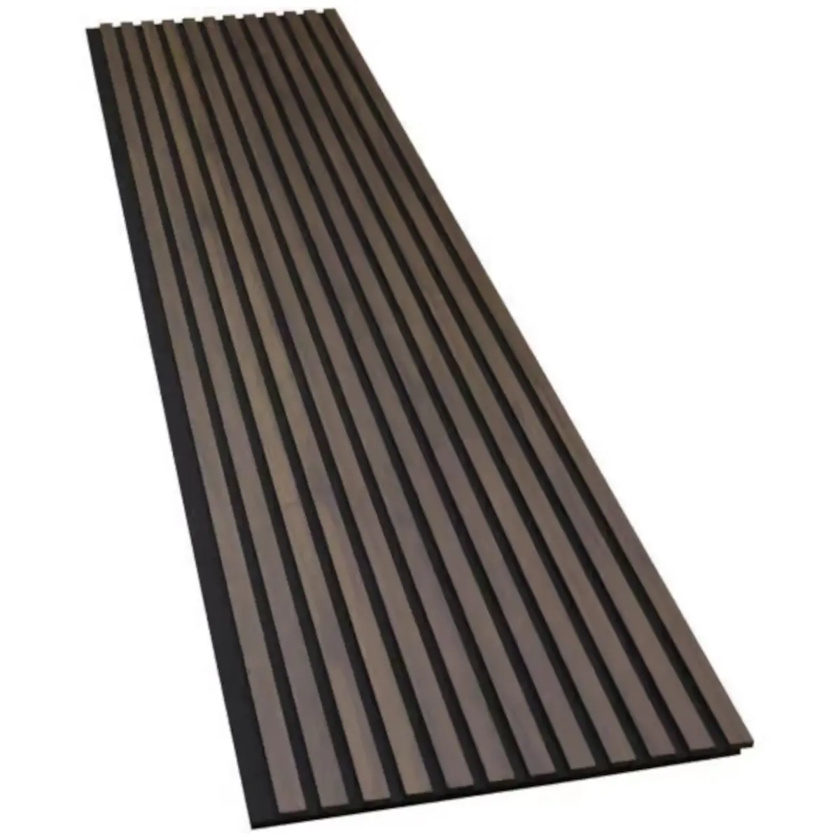 Varje panel består av 14 st ribbor med genomfärgad svart MDF-kärna som har en naturtrogen dekor. Dessutom är akustikpanelerna helt underhållsfria och enkla att montera. Bakom ribborna sitter en 9 mm svart polyesterfilt som är producerad av återvunna PET-flaskor och det används enbart trä som kommer från hållbart skogsbruk.