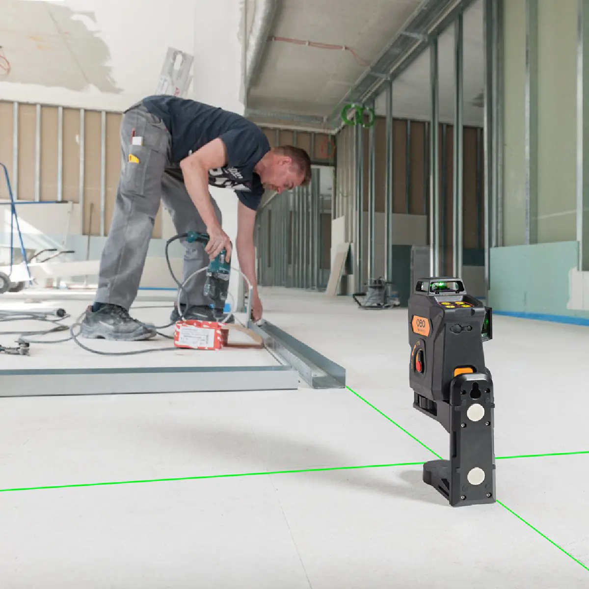 Självnivellerande batteridriven 360° 3-linjelaser. Ger 6 st laserkryss genom att linjerna korsar varandra i 90° mot tak, vägg och golv. Grön laserstråle för bästa synbarhet. Låsfunktion för manuell mätning. Pulsfunktion tillsammans med FR 55 mottagare (ingår ej). Robust gummiklädd konstruktion som skyddar mot stötar. Damm- och vattenskydd enligt IP54. Noggrannhet: +/- 2 mm / 10 m. Batteritid: ca 5-14 h. Självnivellering +/- 3°.