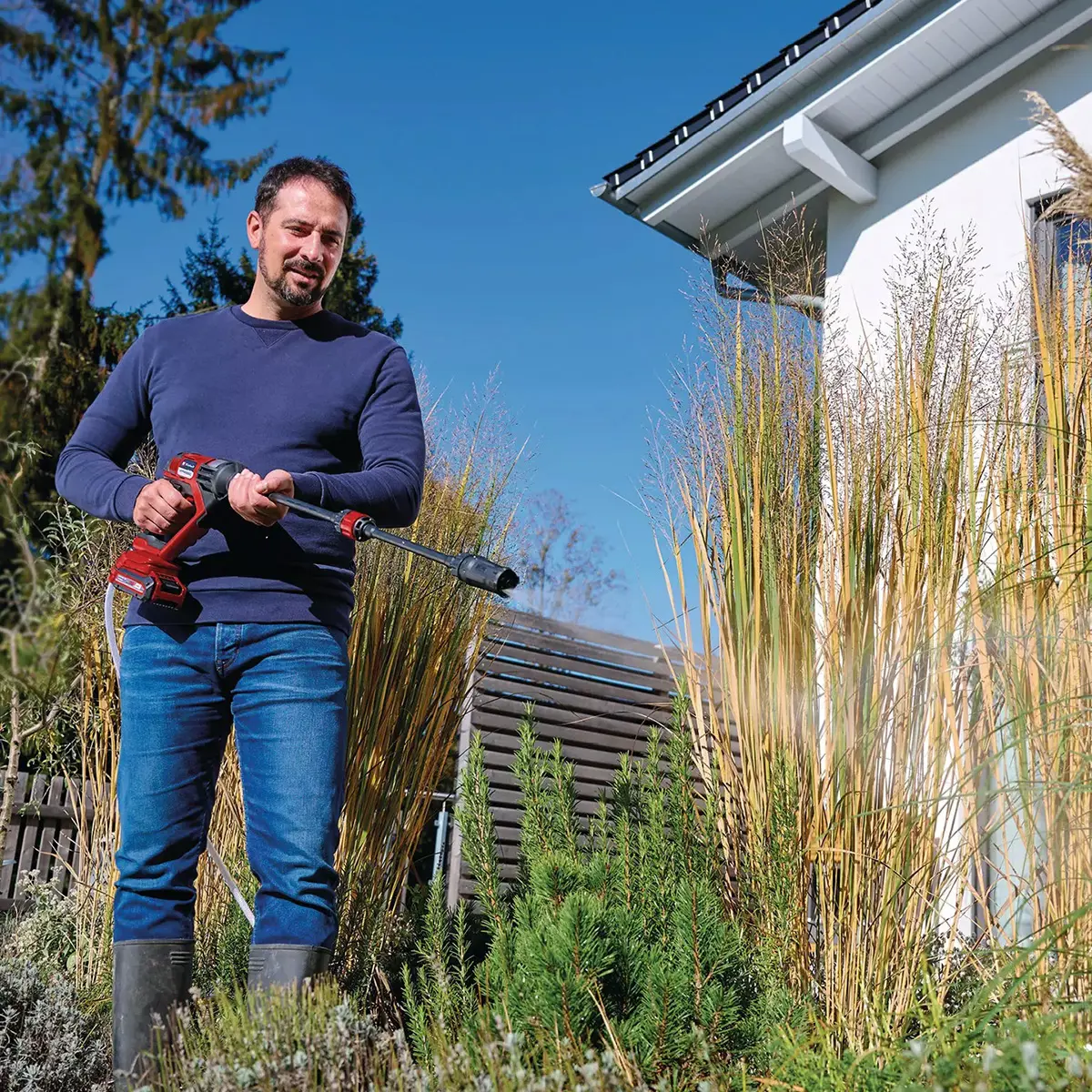 Einhell sladdlös högtryckspistol HYPRESSO 18/24-1 möjliggör sladdlös flexibilitet vid rengöring och vattning runt trädgård och terrass. Den sladdlösa högtryckspistolen ingår i den effektstarka Power X-Change-familjen, där alla batterier, laddare och systemapparater kan kombineras flexibelt med varandra. Den sladdlösa medelhögtryckstvätten arbetar med 24 bars tryck och en matningskapacitet på max. 240 liter vatten i timmen. Tack vare Eco-läget kan gångtiden för högtryckstvättens batteri förlängas med en knapptryckning. Sprutpistolen har ett munstycke som kan ställas i 4 lägen. Den har punkt- och bredstråle, samt en sprutstråle för vattning och rotationsstråle för rengöring av åtsittande smuts. Medeltryck-rengöringspistolen kan inte bara anslutas till trädgårdsslangen tack vare slanganslutningen, utan kan också suga upp vatten ur hinkar, dunkar eller ur en damm, tack vare medföljande 5 meter lång sugslang med vattenfilter. För att använda vatten från vanliga PET-flaskor när du är på språng medföljer en flaskadapter. I leveransen ingår dessutom två förlängningslansar, en skumsprutflaska som lämpar sig perfekt för biltvätt och en nätpåse för förvaring av tillbehör. Dessutom ingår ett stänkvattenskydd för ytterligare skydd av Power X-Change-batteriet från fukt och väta och som enkelt dras över.