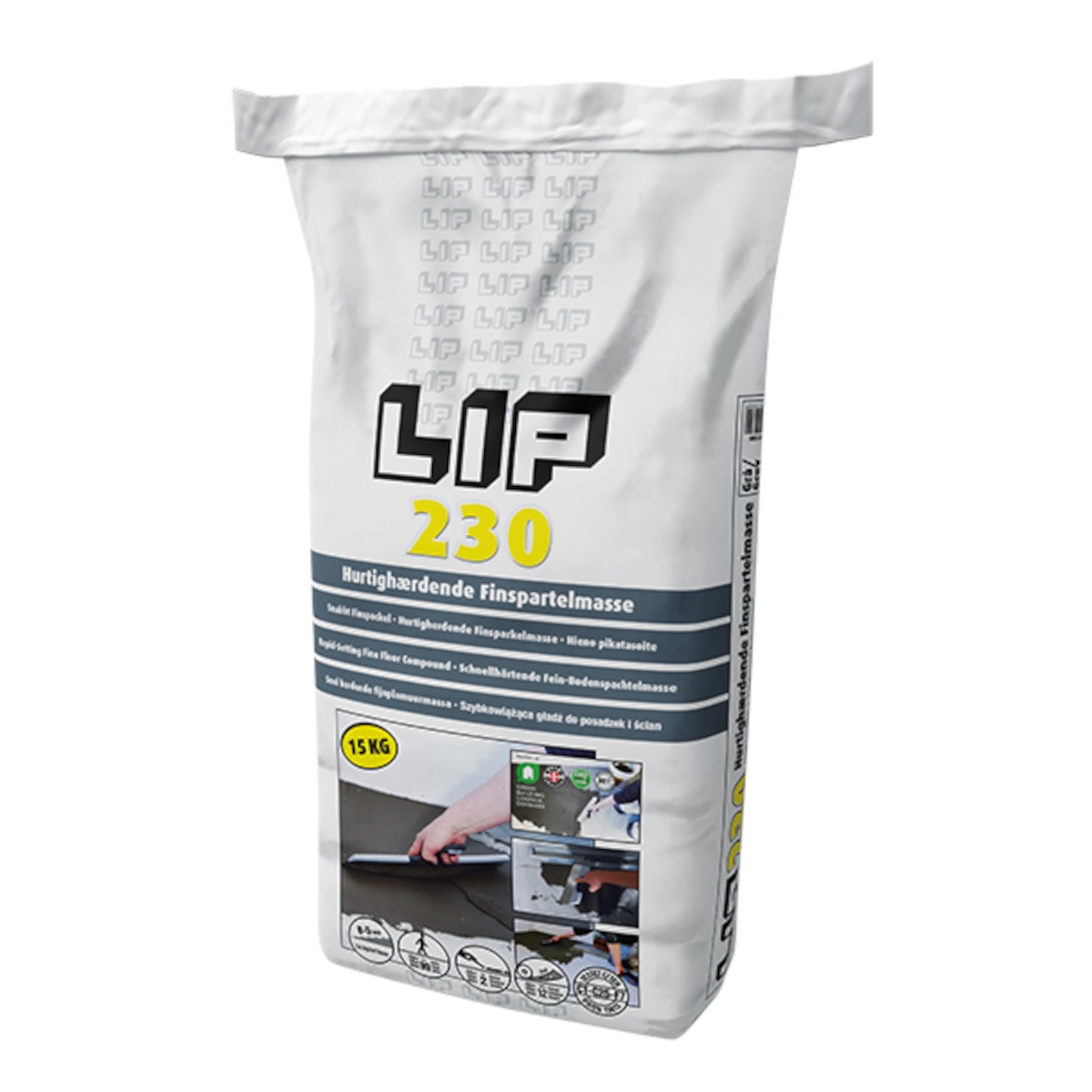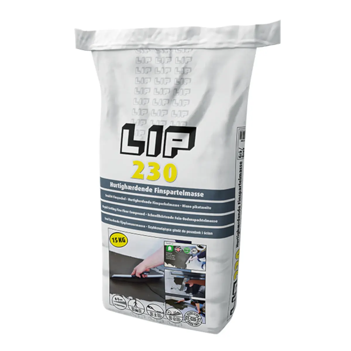 LIP 230 Snabb Finspackel är en cementbaserad, slitstark och flexibel spackelmassa, som används till reparation, utjämning och utspackling av råbetong, cement- och anhydritputs, gjutasfalt, terrazzogolv, kakel- och klinkerbeläggningar, natursten, gasbetong, lättbetong m.m. Är också lämplig till lagning av hål i väggar och trappsteg.