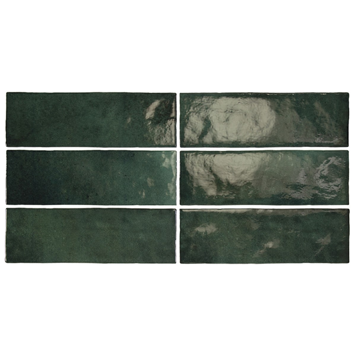 Equipe Artisan Moss Green 6,5x20 är en platta i en varierande djupt grön färg med en vågig och blank yta. Plattans kanter är pressade och något ojämna, vilket skapar ett snyggt rustikt intryck.
