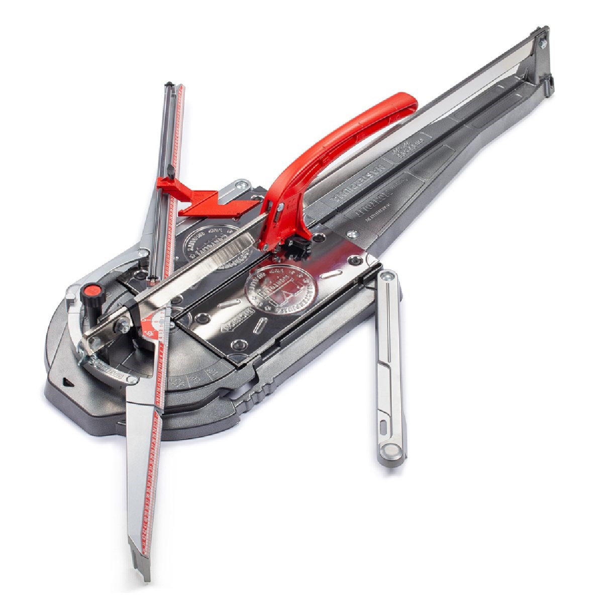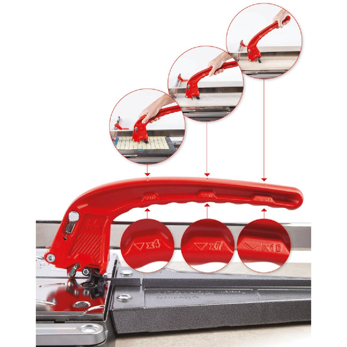 Proffsskärare med robust konstruktion, push-funktion och fjädrande plattstöd. Helgjutna och stabila stödarmar. För kapning av keramik med max plattjocklek upp till 20 mm. Behöver inte justeras för olika plattjocklekar. Ställbar tydlig linjal från -45° till +45°. Tydligare synlighet mot trissan för ökad precision. Unikt handtag med kraft-indikatorer och ”snabbknäck” (behöver inte backas eller ritsa bakåt i startläge). Anhållet kan placeras nära skärlinjen.