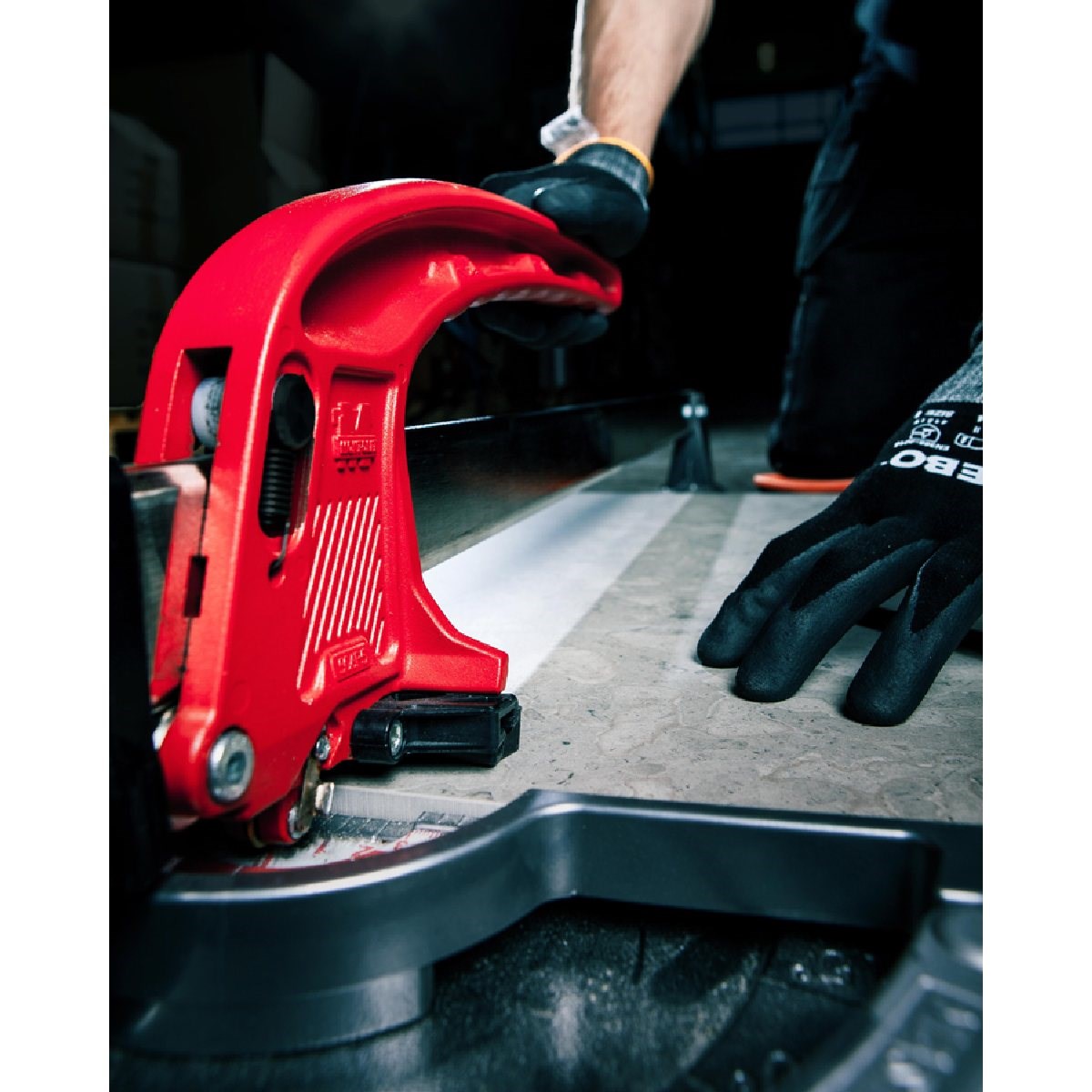 Kakelskärare med push-funktion används genom att skärtrissan dras från användaren och ritsar plattan. Därefter knäcks plattan.