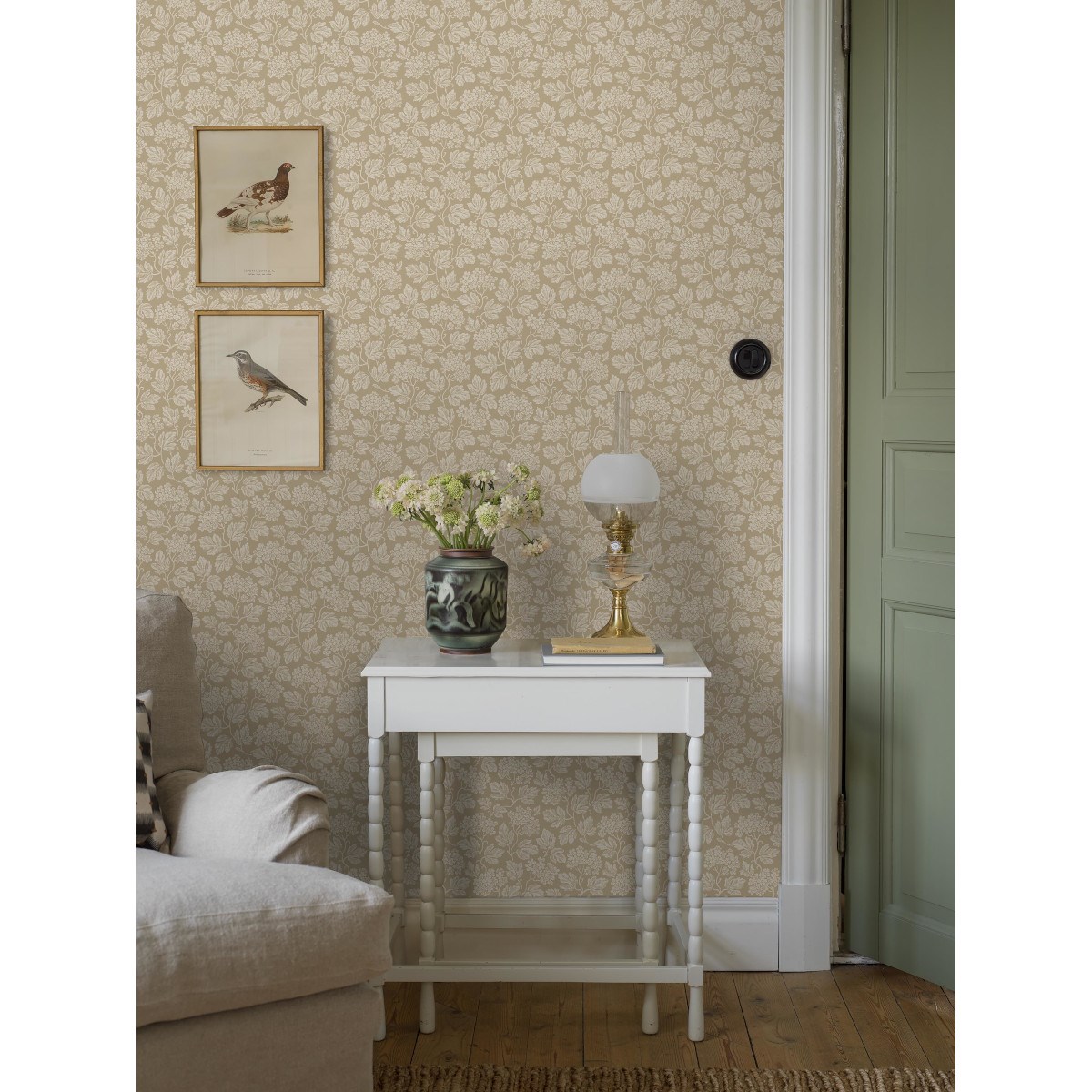 Den ljusa gobelängtapeten Hagtorn går i en varm, neutral färgskala med ljusbeige detaljer på en varmt gyllenbeige botten. Ser du linjerna i mönstret av frodiga blad och blomklasar? De är tänkta att ge ett textilt intryck, och just sådana diskreta linjer eller rutor är typiskt för gobelängtapeterna. Ett medvetet stilgrepp för att ge ytan en ombonad, klädd karaktär.