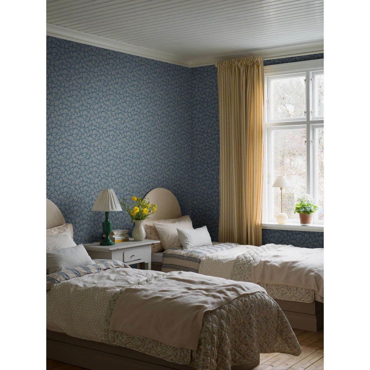 Den blå gobelängtapeten Hagtorn sveper in rummet i lugn och ro. Det täta mönstret av hagtorn i full blom ger ett harmoniskt intryck på väggen, och de diskreta små ränderna i mönstret ger tapeten en textilliknande, ombonad karaktär. Ett diskret raster av rutor eller ränder är typiskt för klassiska gobelängtapeter från tidigt 1900-tal. Just detta mönster tror vi är från perioden 1915–1920.