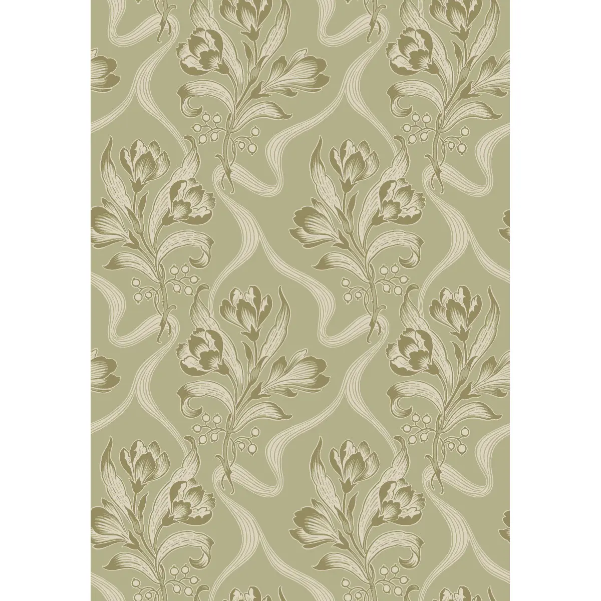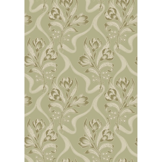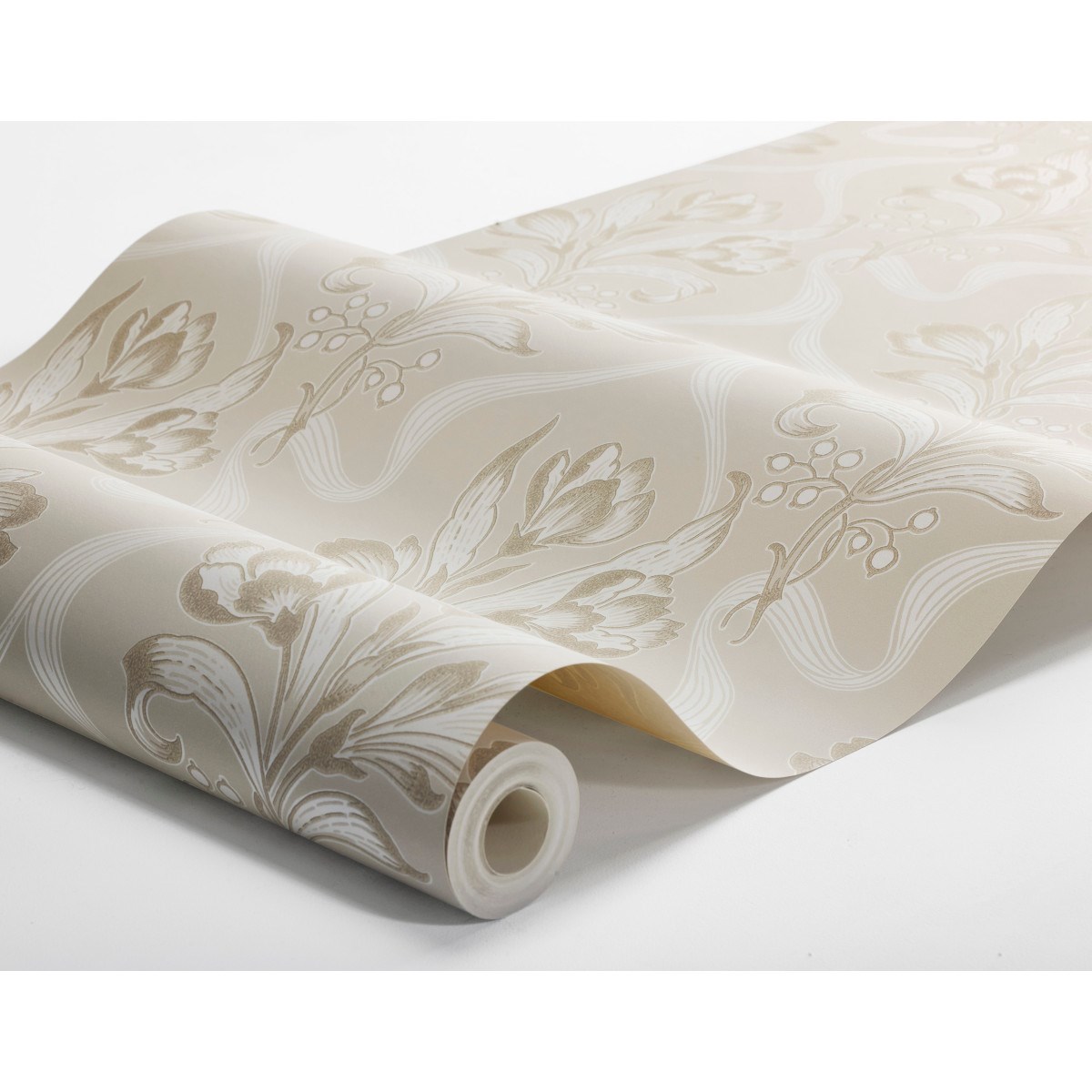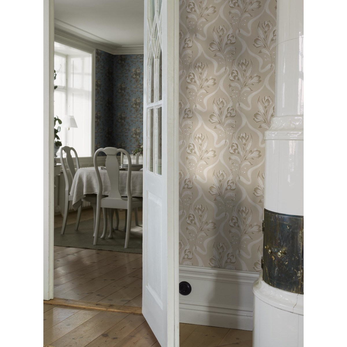 Här går tapeten Jugendbukett i en mjuk, jordnära färgskala med varma toner av gråbrunt och cremevitt på en varmt gråbeige botten. När ljuset faller rätt skimrar de cremevita detaljerna i silver. Skimrande glimmertryck hade förekommit ända sedan 1700-talet men fick ett stort uppsving just under jugendtiden.