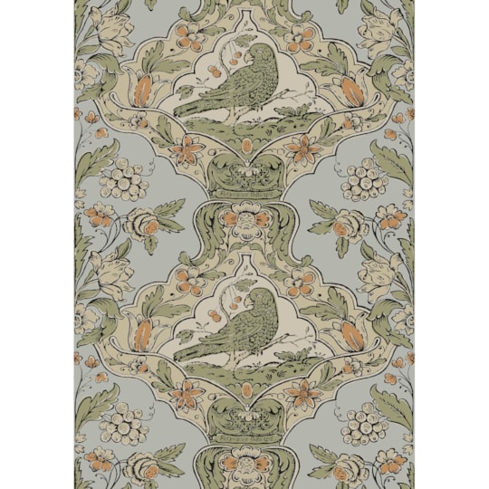 Här ser du tapeten Nejlikerand med bladgröna nejlikor på vit botten. En ljus och frisk färgställning som stämmer väl överens med rokokons lätta färgideal.