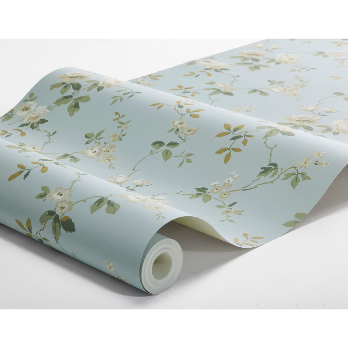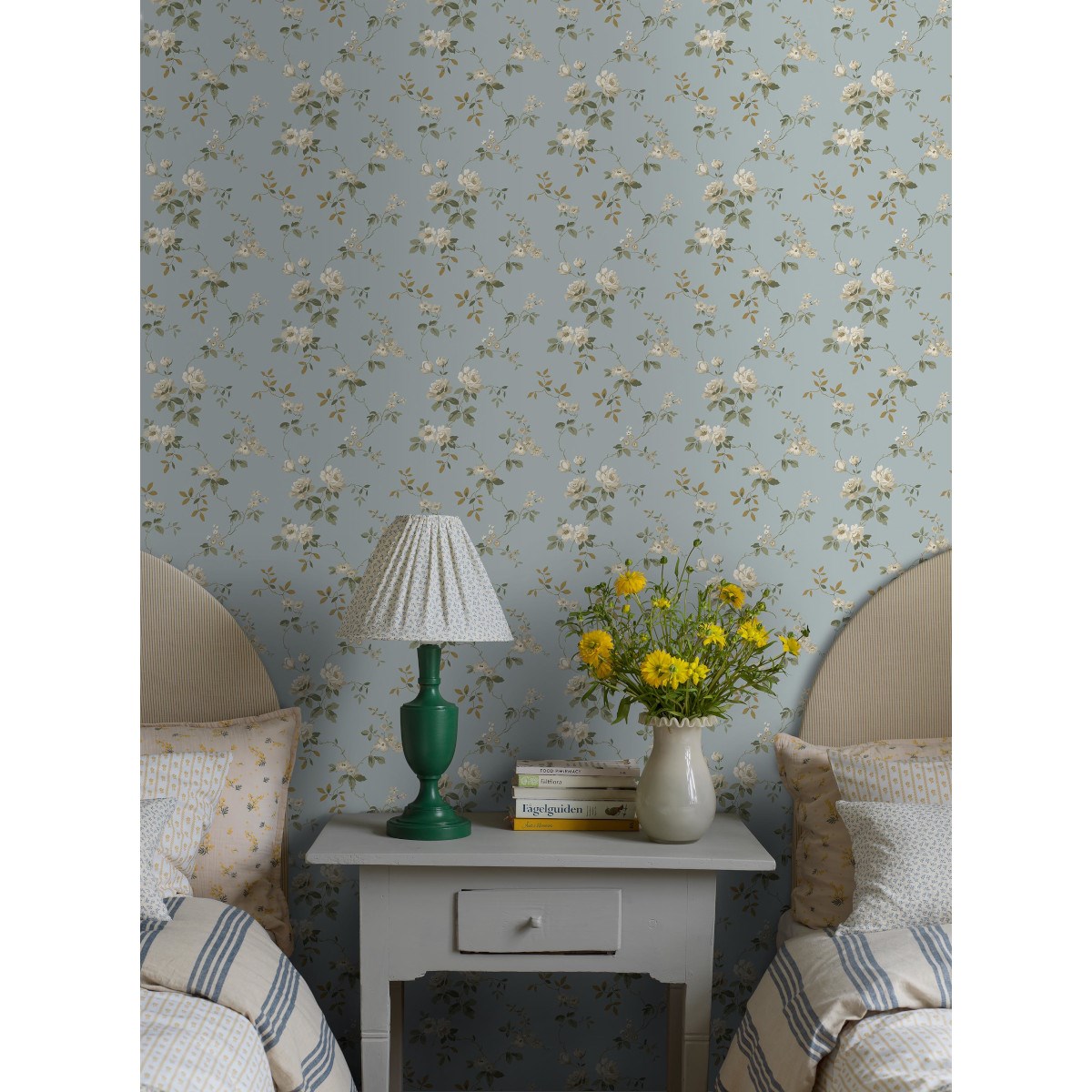 Här ser du tapeten Värmdö limtryckt i en ljusblå nyans med rosor i vitt och beige i ett grågrönt och gulbrunt bladverk.