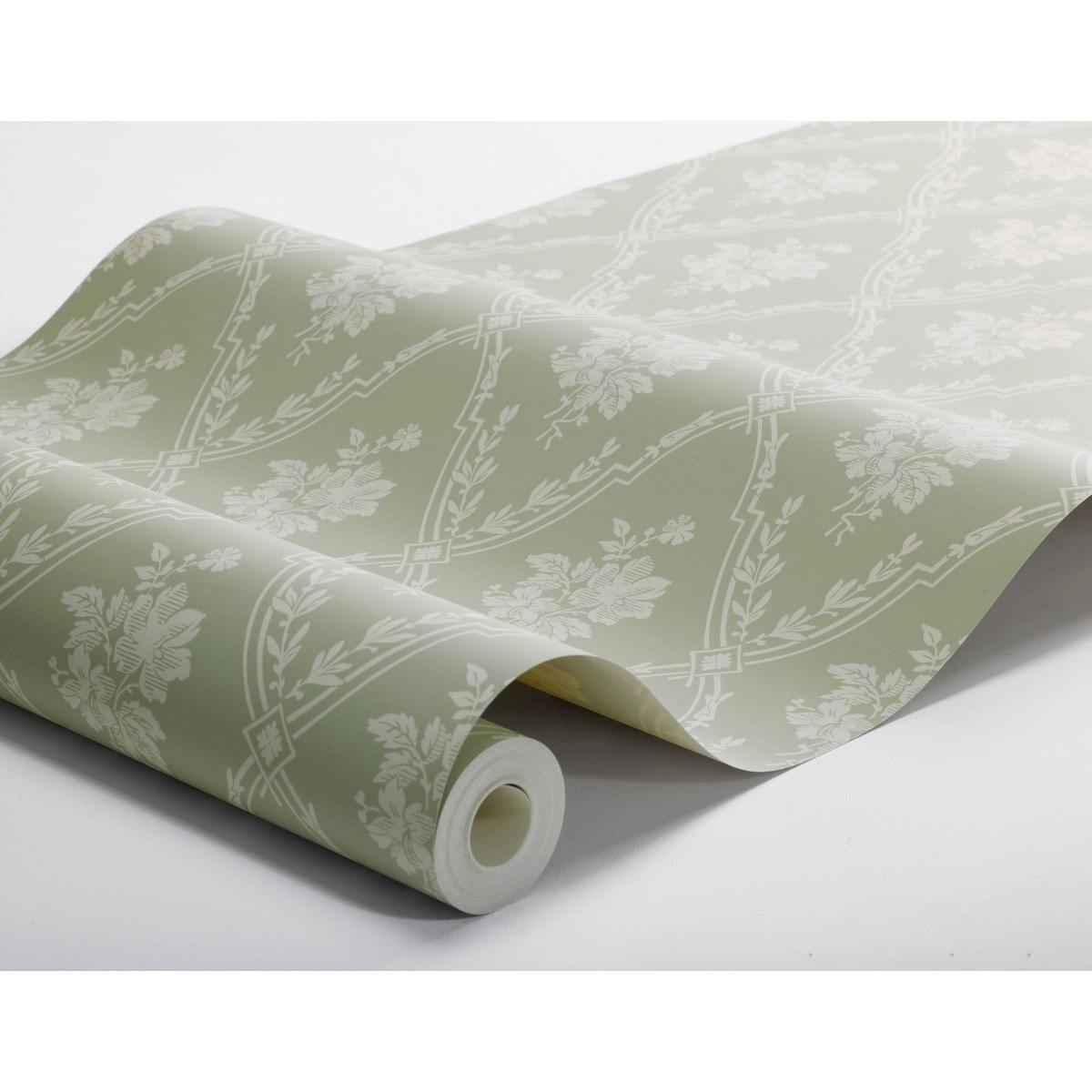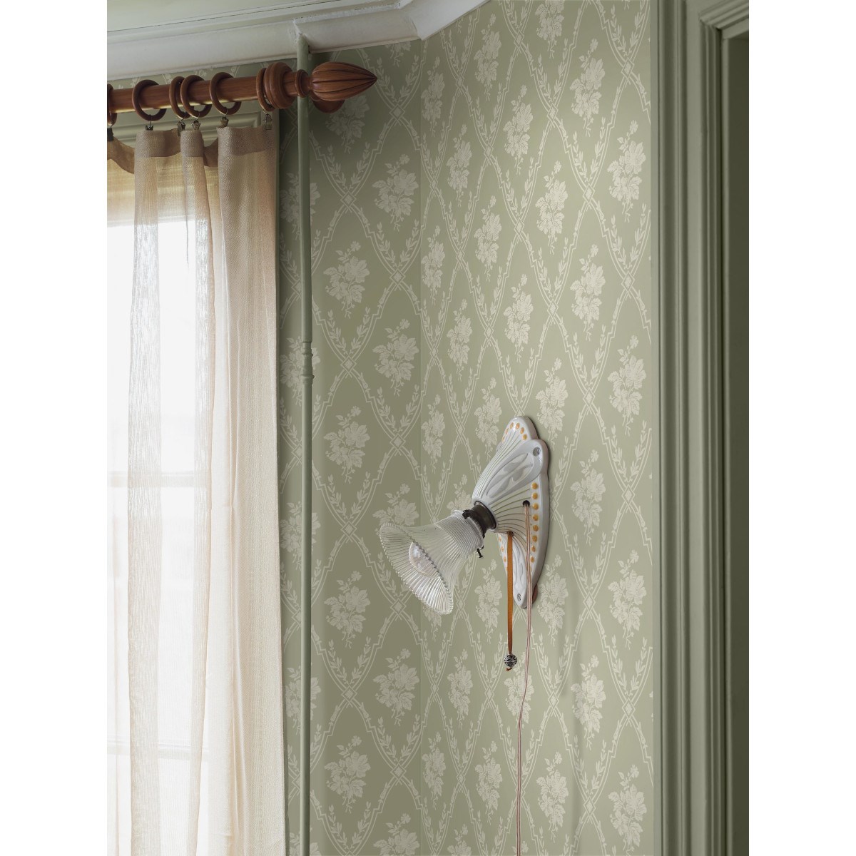 Här ser du tapeten Västigårn i en naturligt harmonisk färgskala: milt lindblomsgrön med cremevita detaljer.