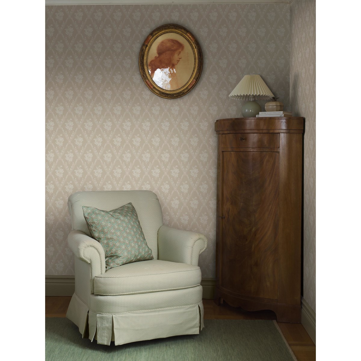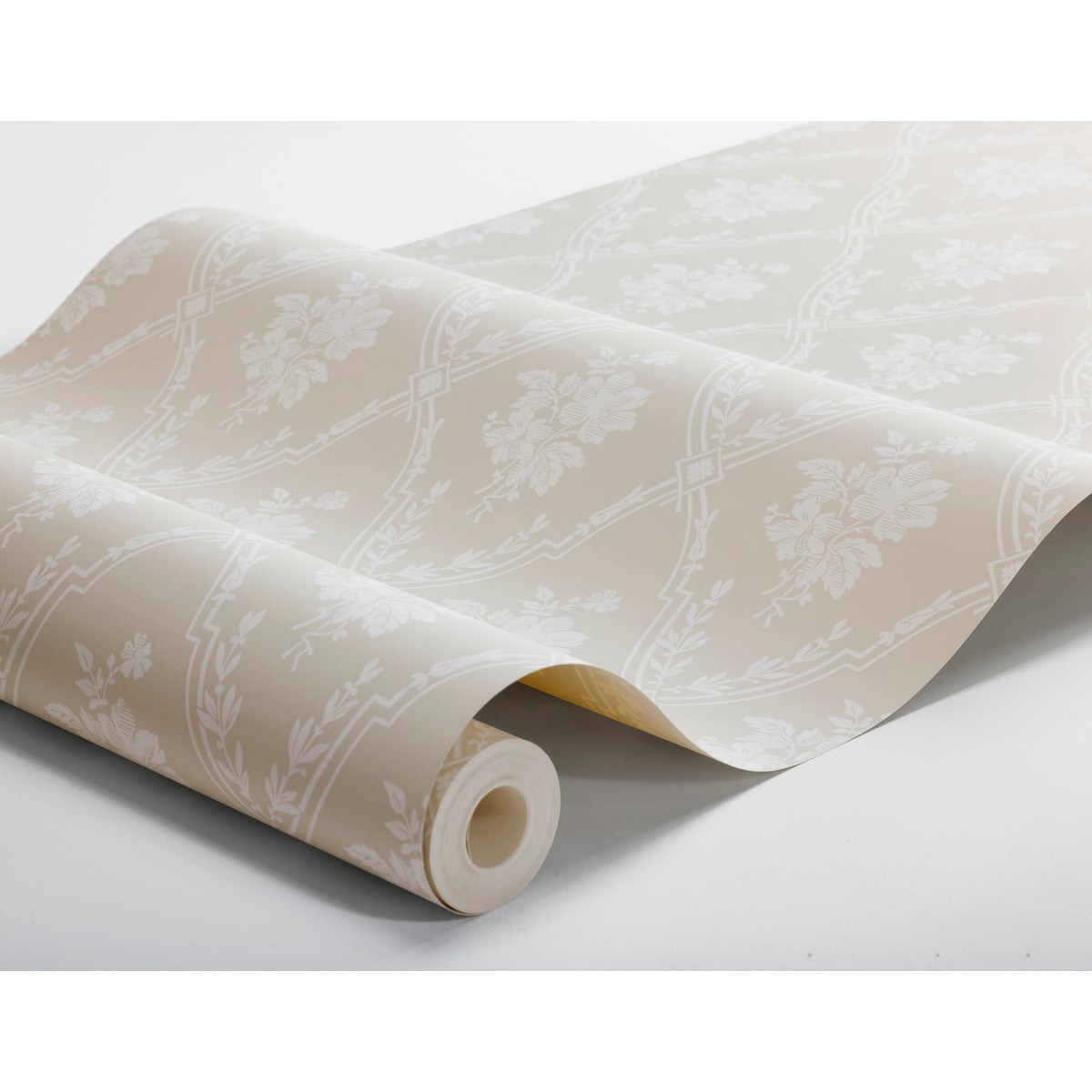 Här ser du tapeten Västigårn i en ljus, neutral färgskala med cremevita detaljer på en ljusbeige botten med drag av grått.