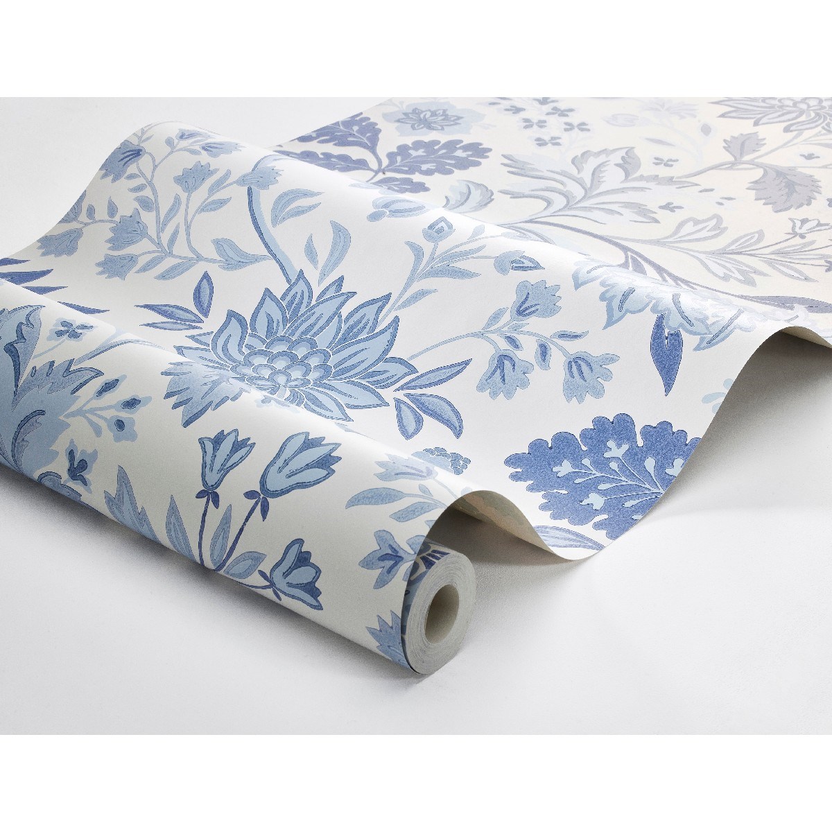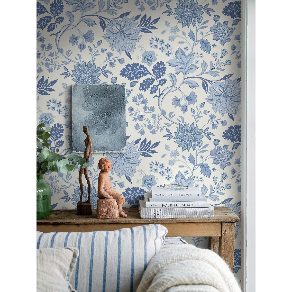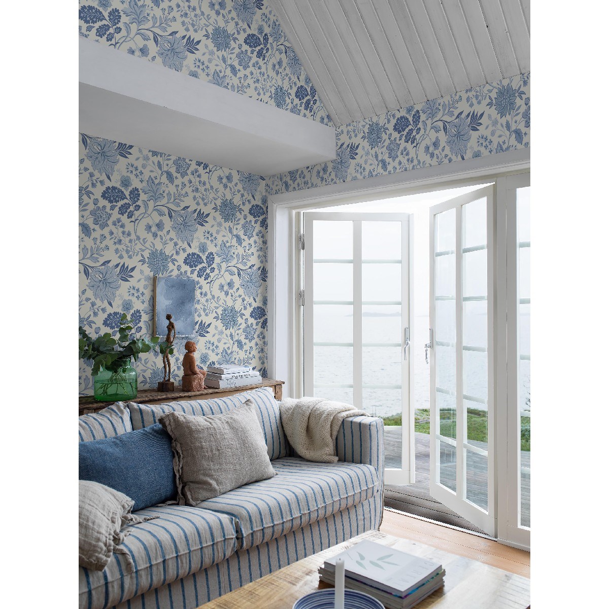 Den storblommiga tapeten Alicia pryds av ett frodigt mönster, handmålat av Sissa Sundling. Stora, prunkande blommor men också söta små blomster och sirliga bladverk, allt i skön harmoni. En ombonad tapet som känns både rofylld och levande.Här går tapeten Alicias blommönster i olika blå toner, såväl varma som kalla, på en mjukt cremevit botten. En tidlös, klassisk tapet som limtrycks på traditionellt vis för det där genuina, levande uttrycket som ger en så trivsam känsla i rummet.