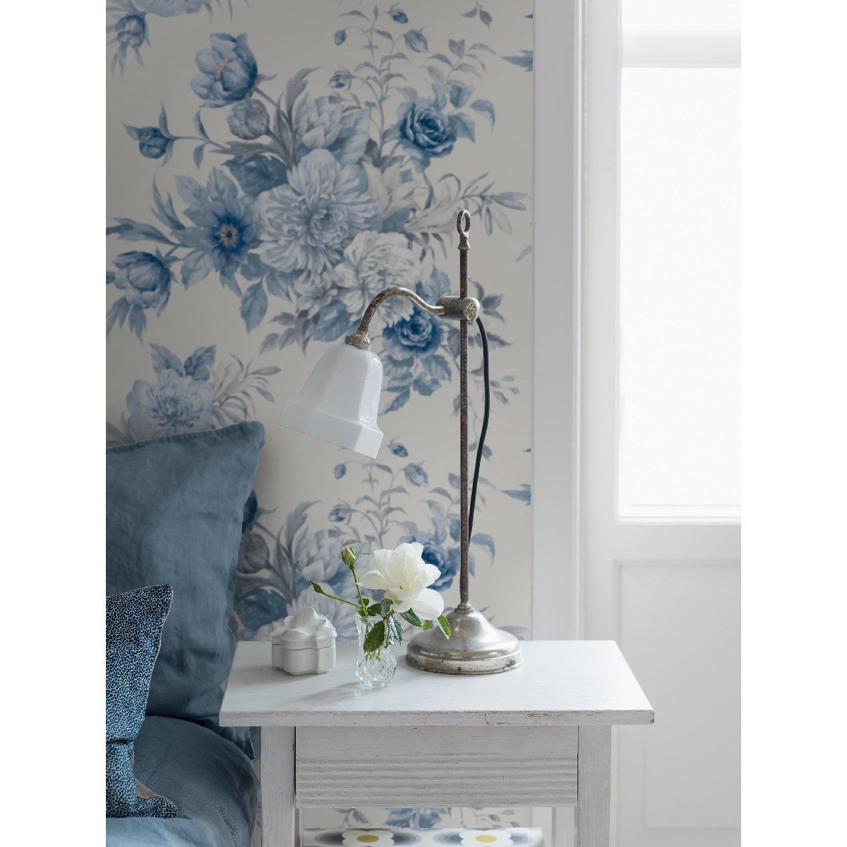 Ljusa Floral Charm är en romantisk, storblommig tapet prydd av prunkande blomsterbuketter. Mönstret har målats för hand i akvarell för att sedan tryckas på en elegant botten vars diskreta mönster för tankarna till råsiden – lyxigt, elegant och sinnligt. Här ser du tapeten Floral Charm med blå blommor på porslinsvit botten. En fräsch, klassisk färgställning som känns både lantlig och elegant, och aldrig går ur tiden.