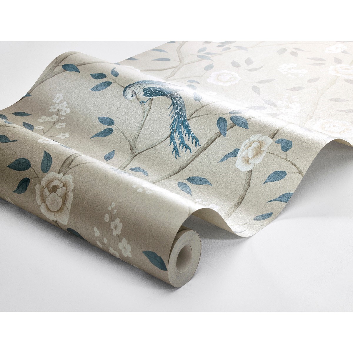 Den blommiga tapeten Paradise Birds pryds av ett romantiskt mönster av blommor och exotiska fåglar, tydligt inspirerat av 1700-talets Chinesoise-målade väggar. Mönstret är målat för hand i akvarell för att sedan digitaltryckas på en skimrande satängbotten som ger tapeten en lyxig känsla och ett fantastiskt djup.Här ser du tapeten Paradise Birds i blå och vita toner på en varmt gråbeige botten som verkligen framhäver det sirliga mönstret. Klassisk elegans!