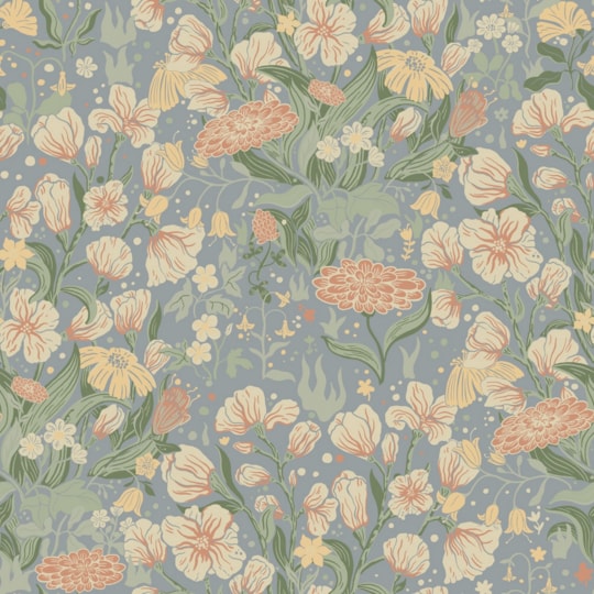 Vitbeige tapet med blå blommor och blad i olika färger