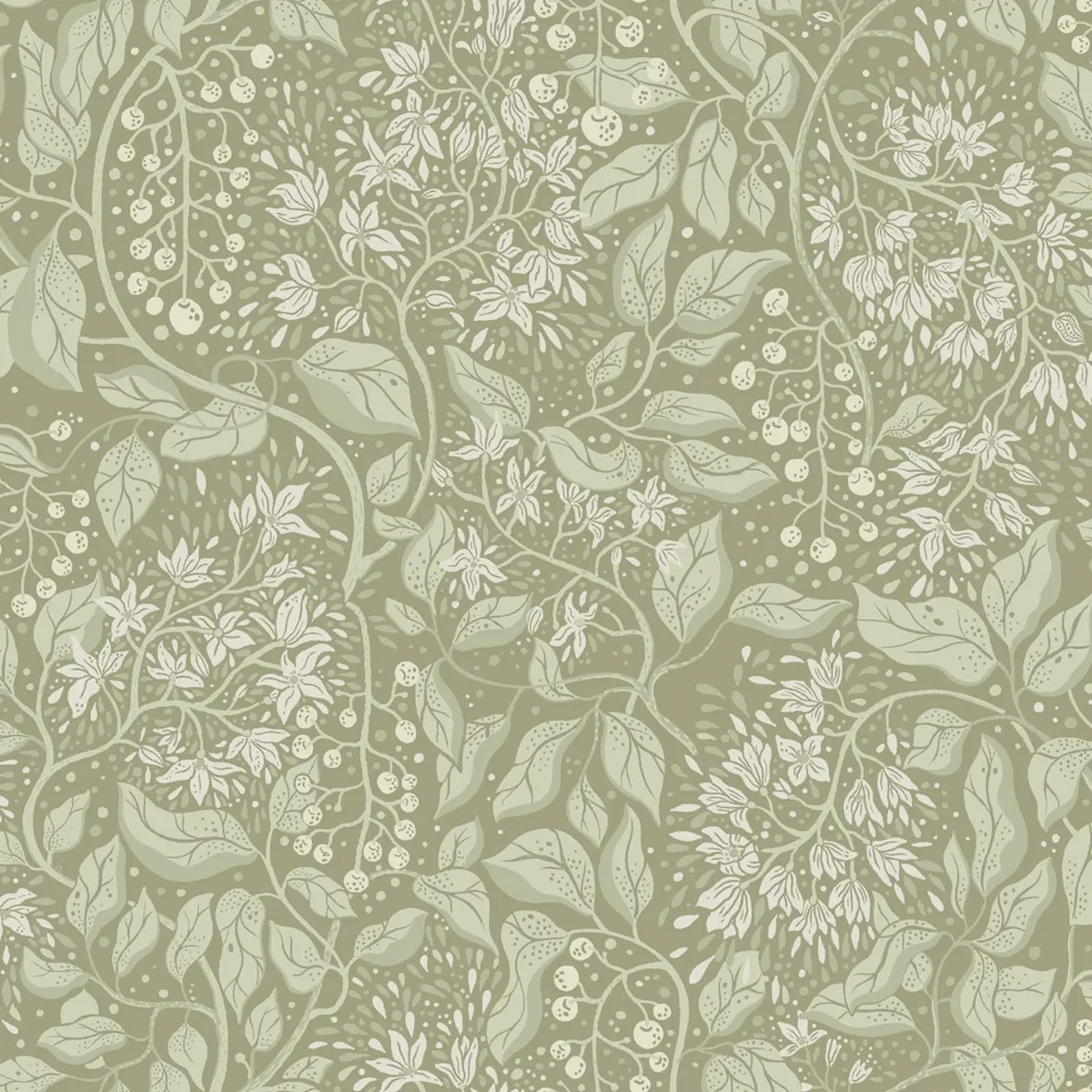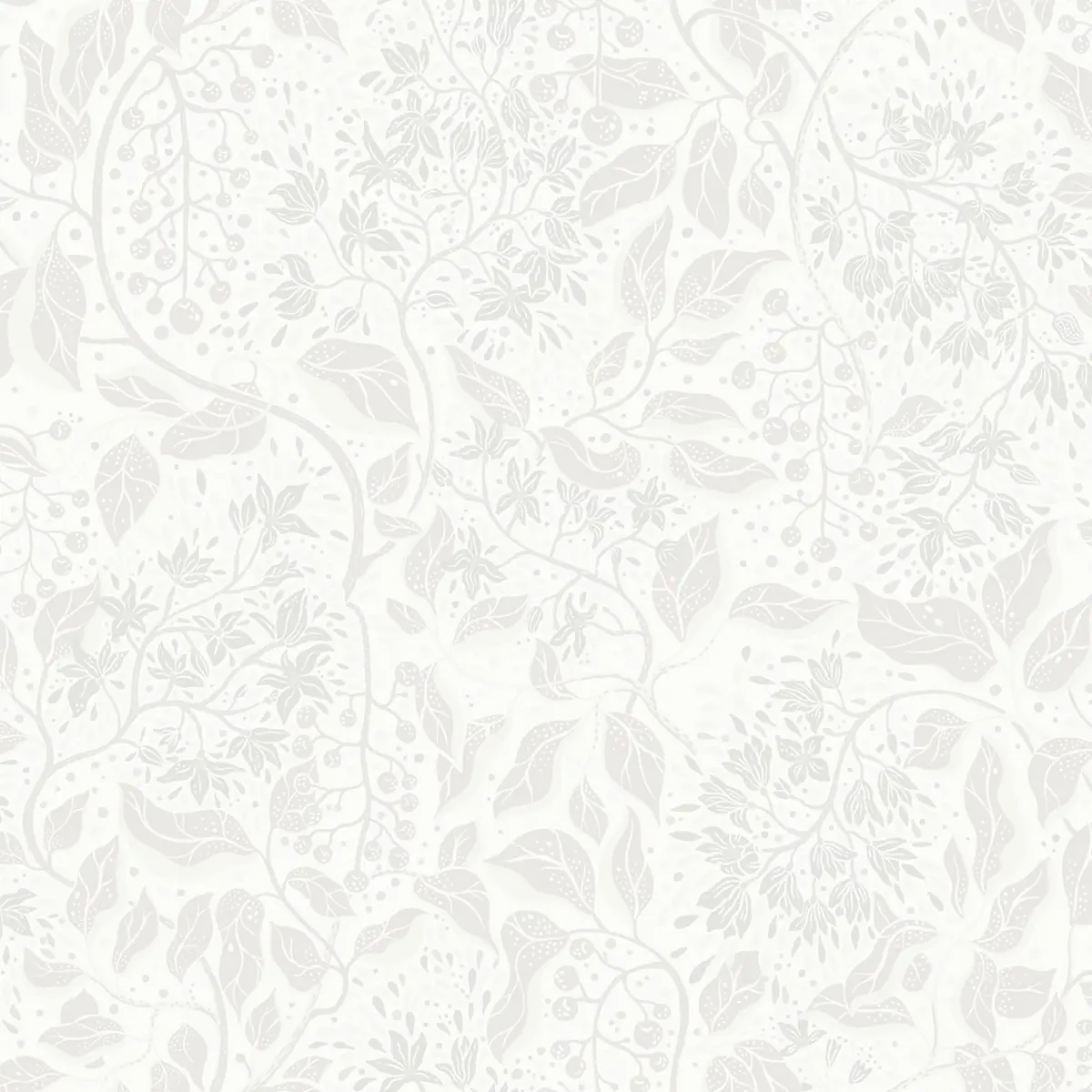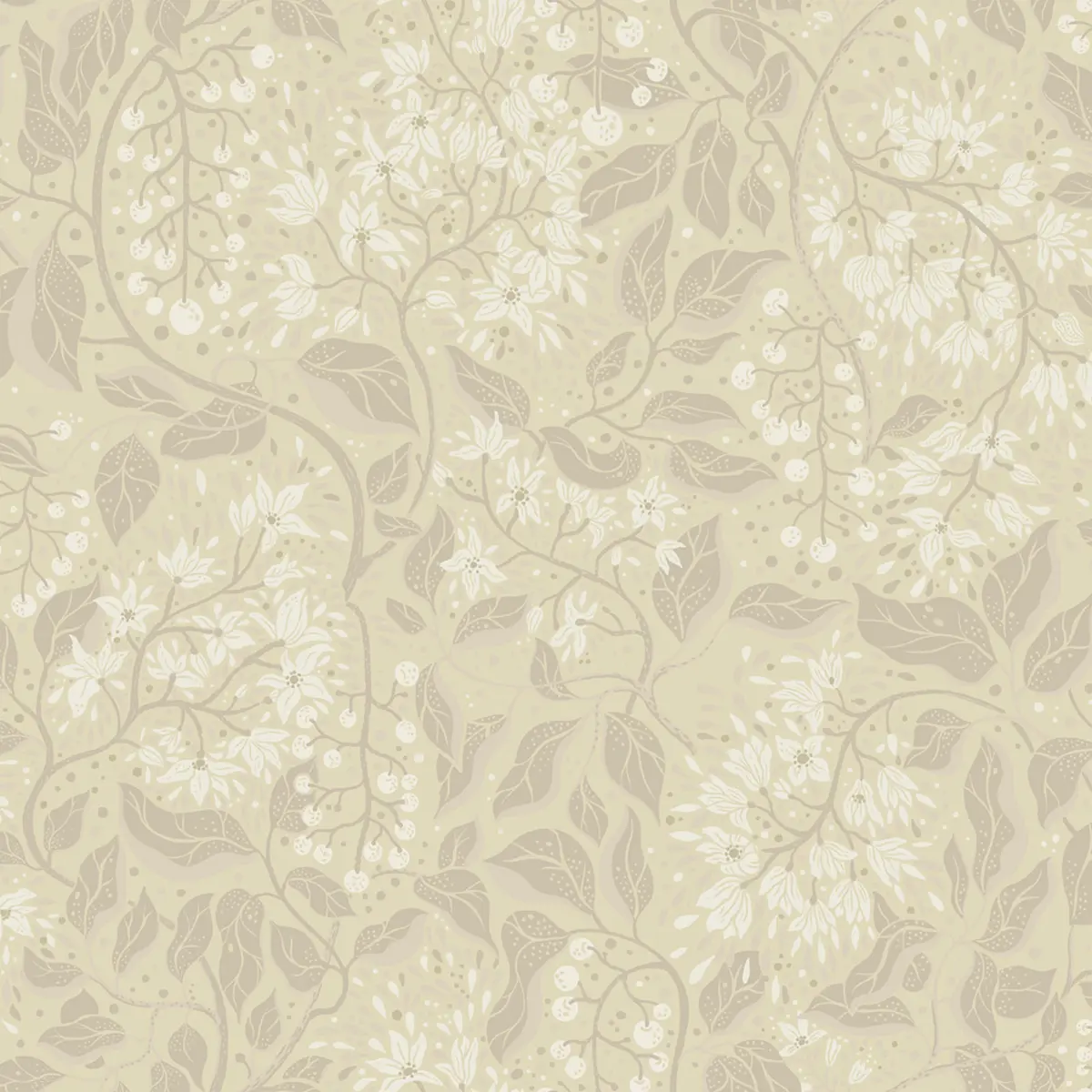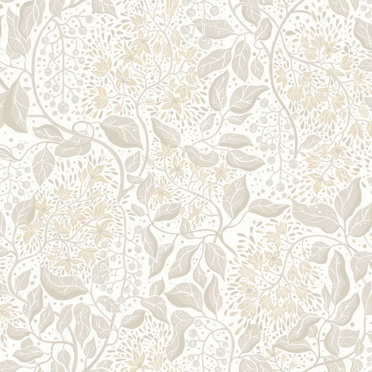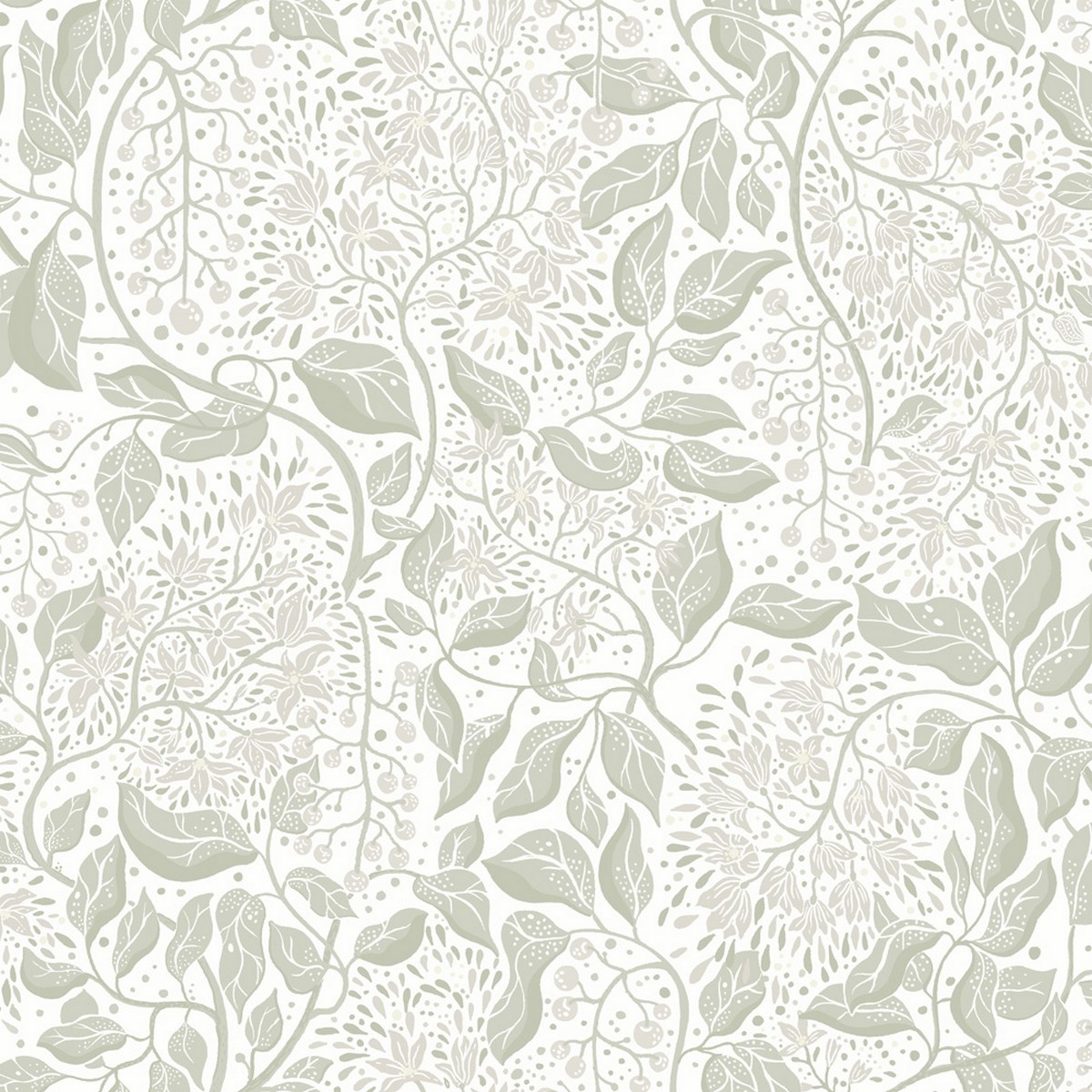 Vit tapet med neutrala blommor och gröna blad I kollektionen Fägring har Lina Schnaufer jobbat med livet och livscyke...