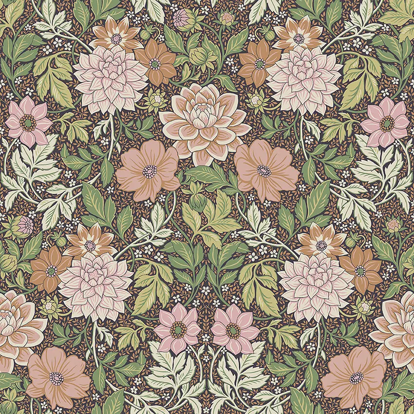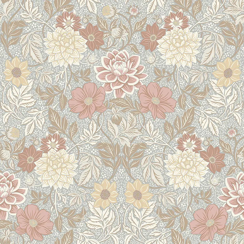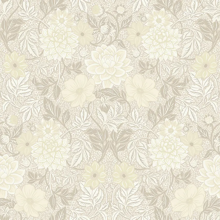 Boråstapeter Falsterbo III Dahlia Garden 7664. Den storblommiga tapeten Dahlia Garden är skapad som en hyllning till sensommarens prunkande dahliarabatter. Ytan är täckt av ett Arts & Craft-inspirerat blomsterornament med praktfulla dahlior mot en botten av sirliga blad. Ett lugnt men samtidigt levande mönster som skapar en trivsam, ombonad känsla i rummet. Dahlia Garden är handmålad av Jenny Hahne Gadd och trycks i tre färgställningar. Här ser du tapeten i harmoniska toner av grått, beige och vitt.Älskade klassiker och nya favoriter inspirerade av Boråstapeters svenska sommar! 38 hemtrevliga och lantliga tapeter i milda, dämpade nyanser och traditionellt limtryck för en vackert levande yta. Rutan, randen och den svenska sommarens alla nyanser- lantliga tapeter för hem fyllda med omtanke och värme. Här finns gläntans skugga, blomsterängens sol och torpets prunkande sensommarrabatt. Några mönster är också inspirerade av traditionella textilier, som handvävda kökshanddukar. Alla tapeterna är limtryckta på traditionellt vis i en mild, dämpad färgskala. Svensk hantverkstradition har alltid legat Boråstapeter varmt om hjärtat. Nu skapar Boråstapeter nya uttryck i samma anda.