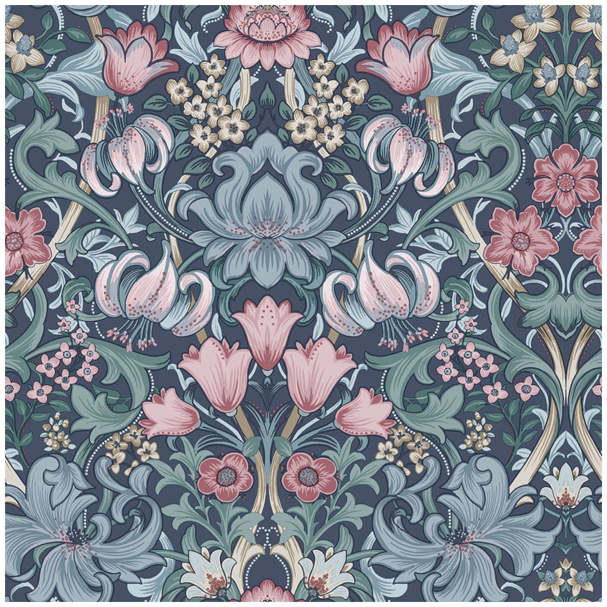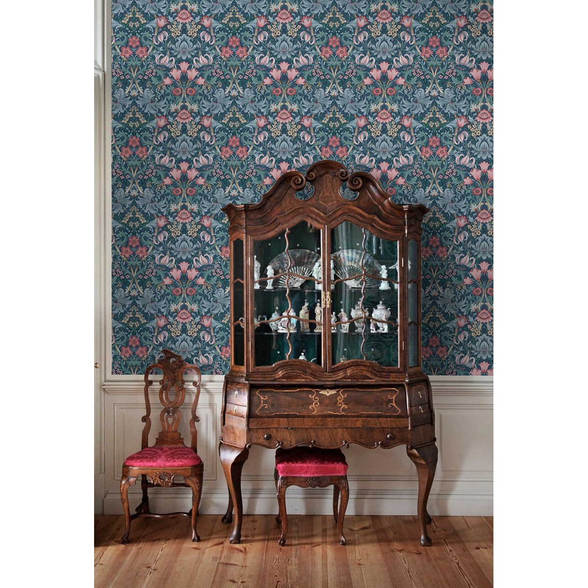 Ett utsmyckat blommigt damastmönster fyllt med stiliserade blad och slingrande rankor. Speglade organiska former utstrålar tidlös elegans och upprepas över tapeten, där lyx och sofistikering balanseras harmoniskt.