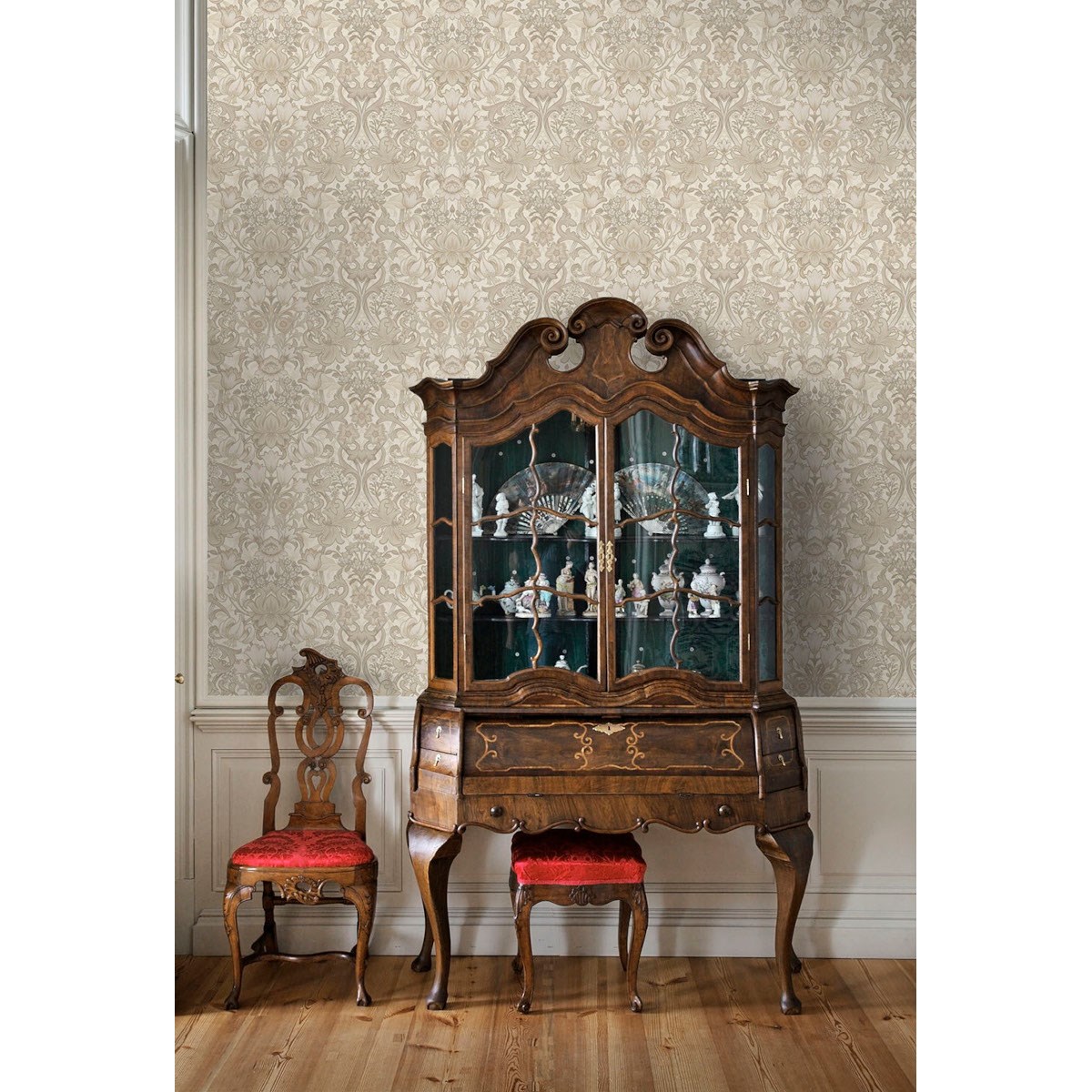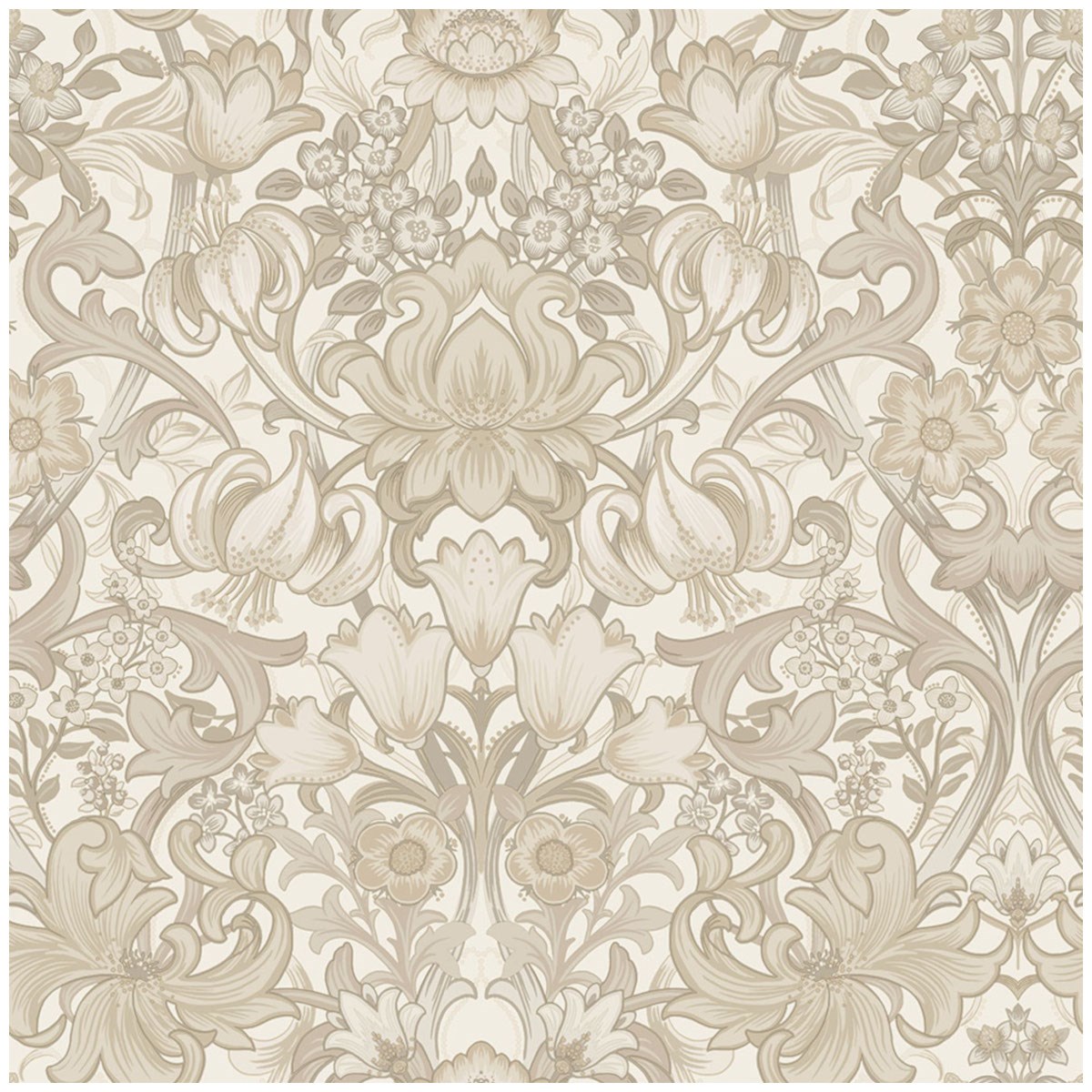 Ett utsmyckat blommigt damastmönster fyllt med stiliserade blad och slingrande rankor. Speglade organiska former utstrålar tidlös elegans och upprepas över tapeten, där lyx och sofistikering balanseras harmoniskt.