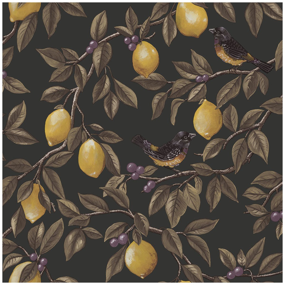 En vackert målad citronslinga med grenar prydda av frodiga gröna blad, varvat med bär och gyllene citroner. Bland mönstret sitter fåglar på grenarna, vilket skapar en harmonisk blandning av klassiska och moderna inslag på denna lekfulla tapet.