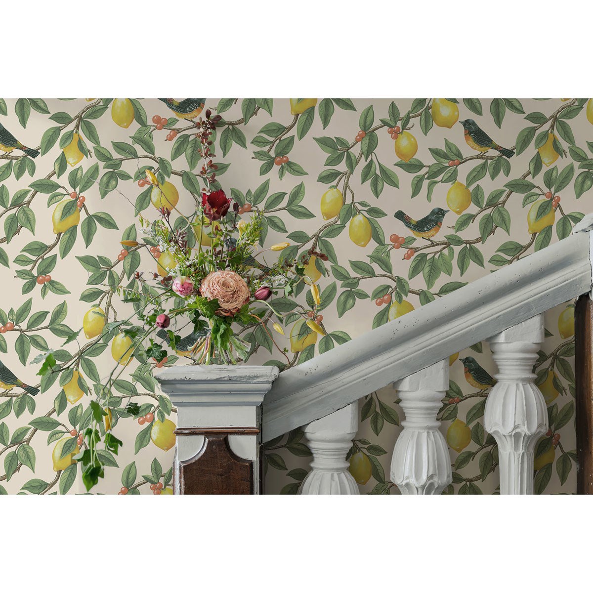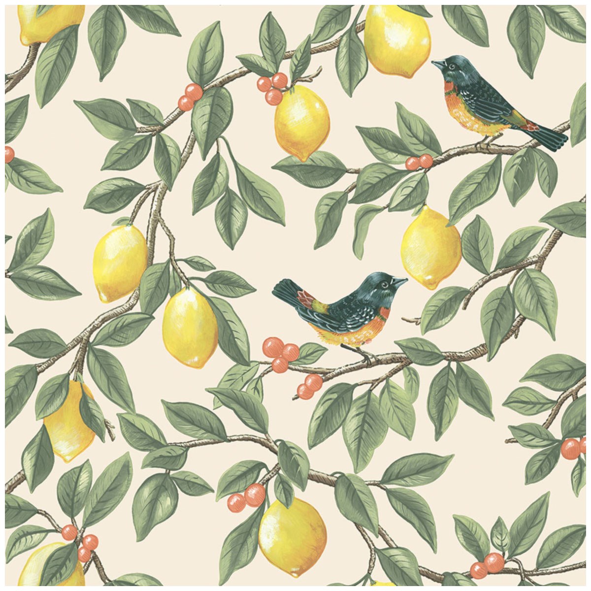 En vackert målad citronslinga med grenar prydda av frodiga gröna blad, varvat med bär och gyllene citroner. Bland mönstret sitter fåglar på grenarna, vilket skapar en harmonisk blandning av klassiska och moderna inslag på denna lekfulla tapet.