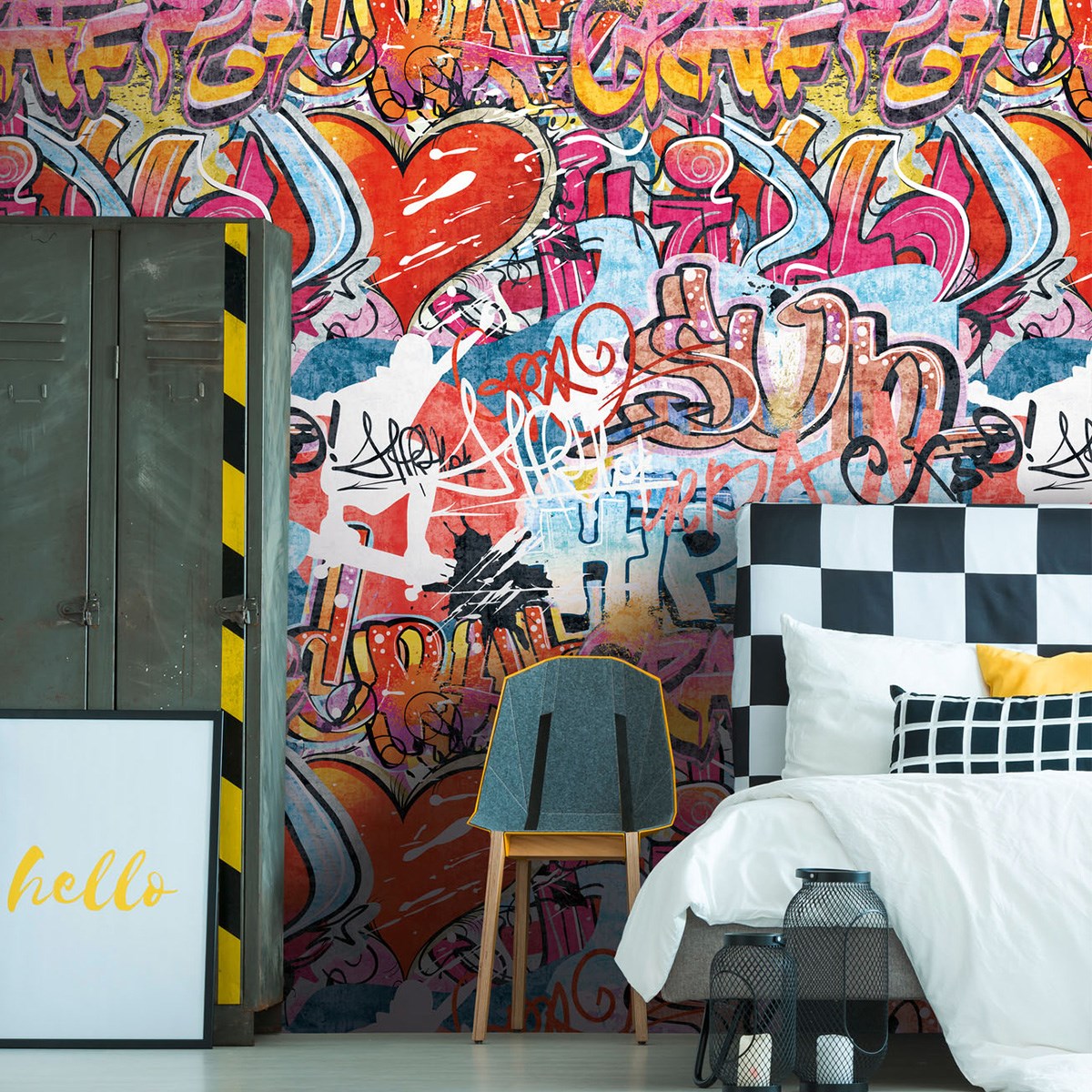 Ge rummet en urban och kreativ känsla med Boys & Girls 7 – 77063-1, en grafittiinspirerad fototapet full av färg, energi och street art-attityd. Med lager av text, sprayade linjer, figurer, färgblock och dynamiska rörelser blir väggen ett konstverk som lyfter hela rummet och skapar en unik storstadsvibe.