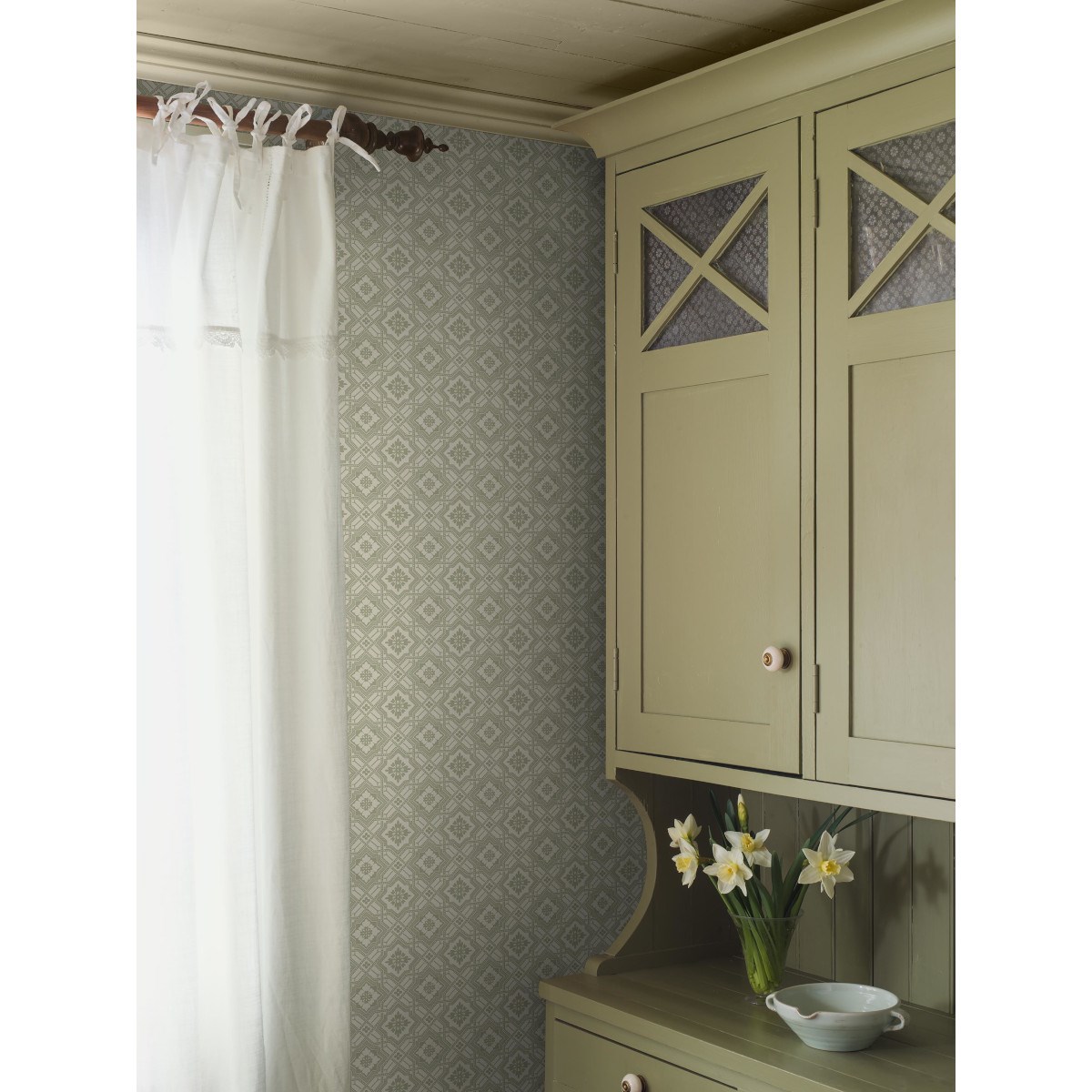Här går tapeten Friedrich i en mjuk, grön färgställning med ljust grönvita detaljer. På håll flyter det geometriska mönstret samman till en harmonisk helhet men går du nära ser du prickar, linjer, stjärnor och söta små blommor.