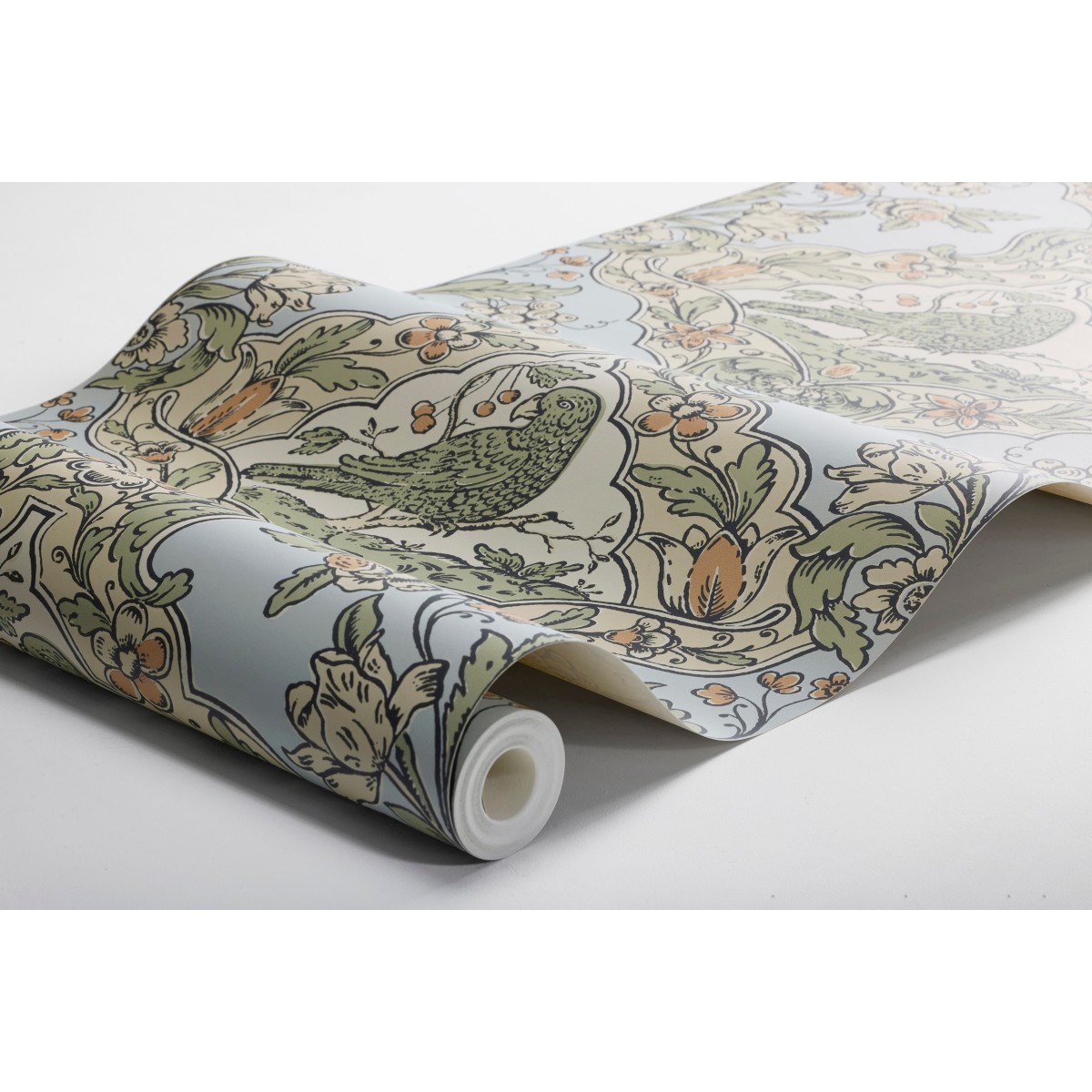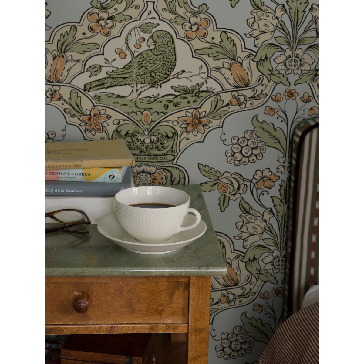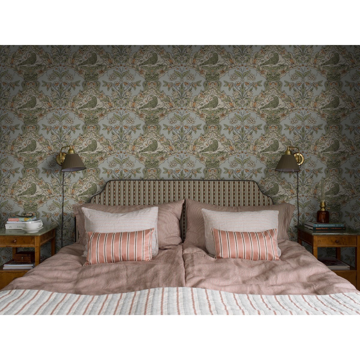 I vår nytolkning går tapeten Skenninge i milda toner av grönt, rostrött och dämpat honungsgult på en varmt blekblå botten.