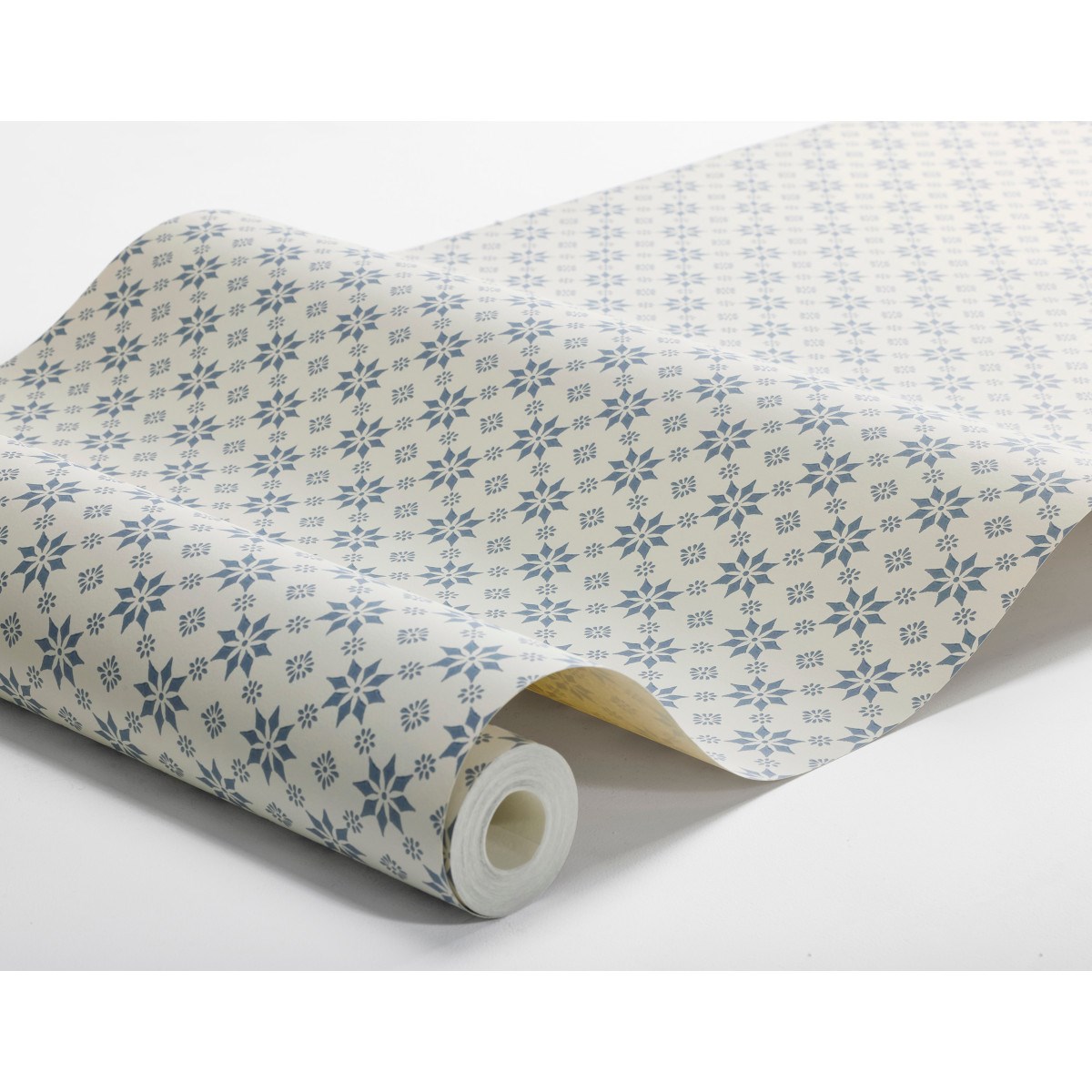 Här ser du Stella med blå stjärnor på naturfärgad/ljusbeige botten. Tapeten trycks på traditionellt vis med flödigt limtryck för en taktil, levande yta med den rätta hantverksmässiga känslan.
