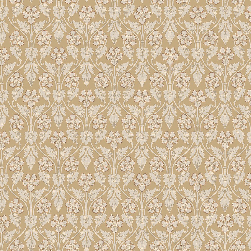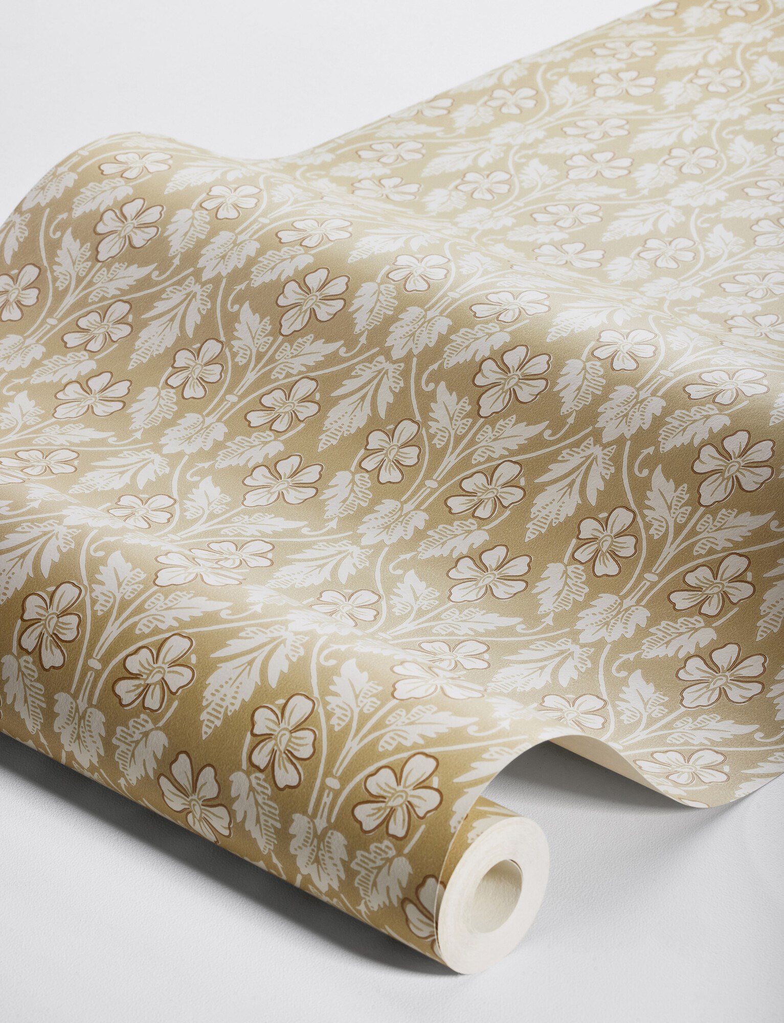 Här ser du tapeten Nora med blommor i ljusbeige med orangeröda konturer på en varmt gul botten. Uttrycket är varmt och glatt men också lugnt, och visst andas mönstret lite Arts & Crafts? Fin i till exempel kök, barnrum och hall.