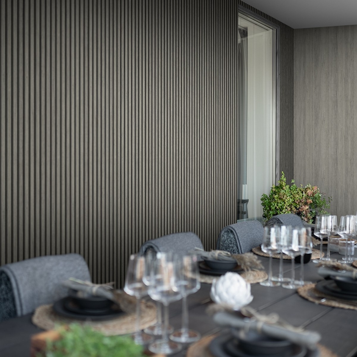 Tapet med smal träpanel i grålackad ek. Upptäck ett experimentellt möte mellan det mjuka industriella och det naturli...