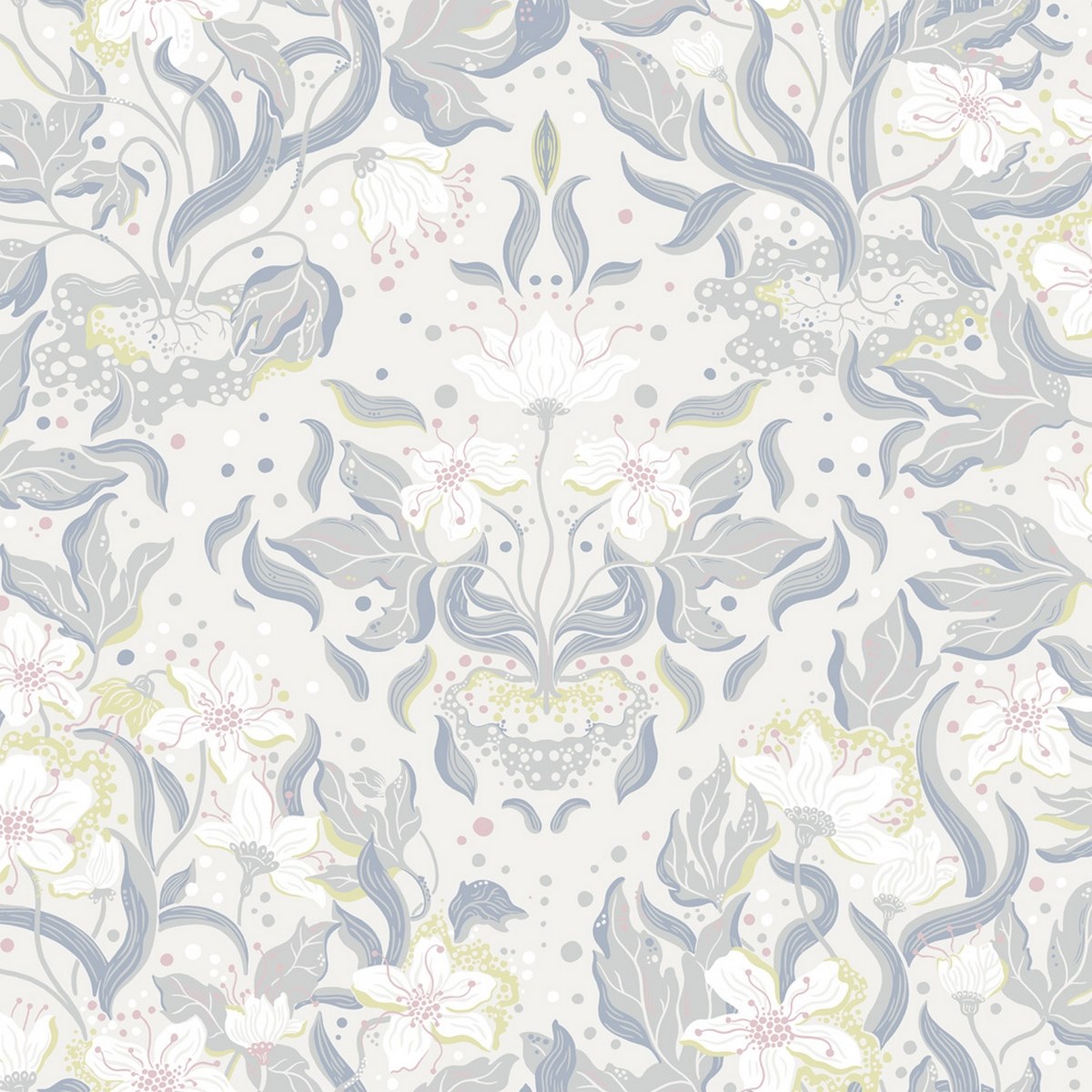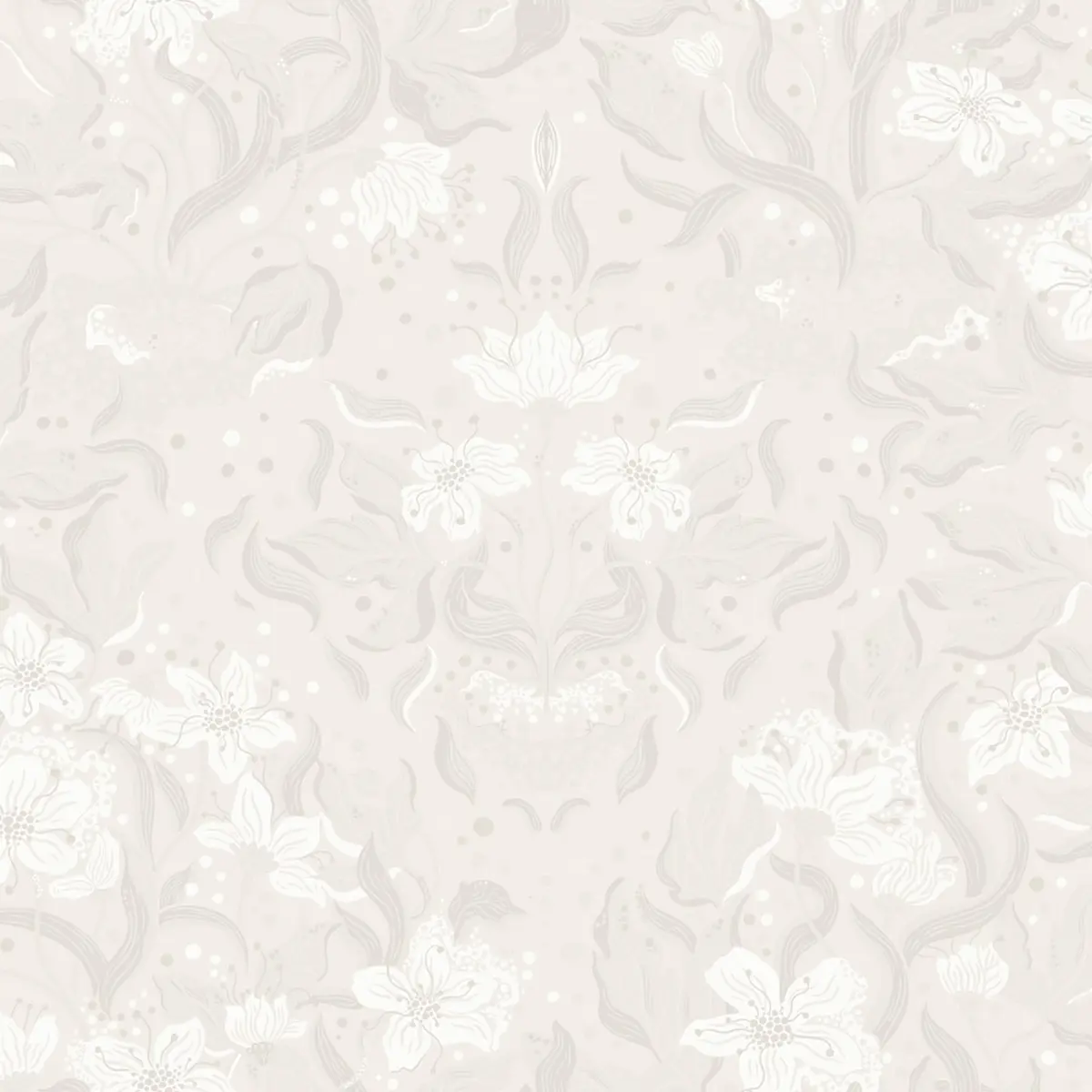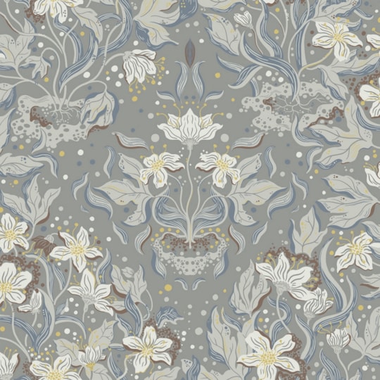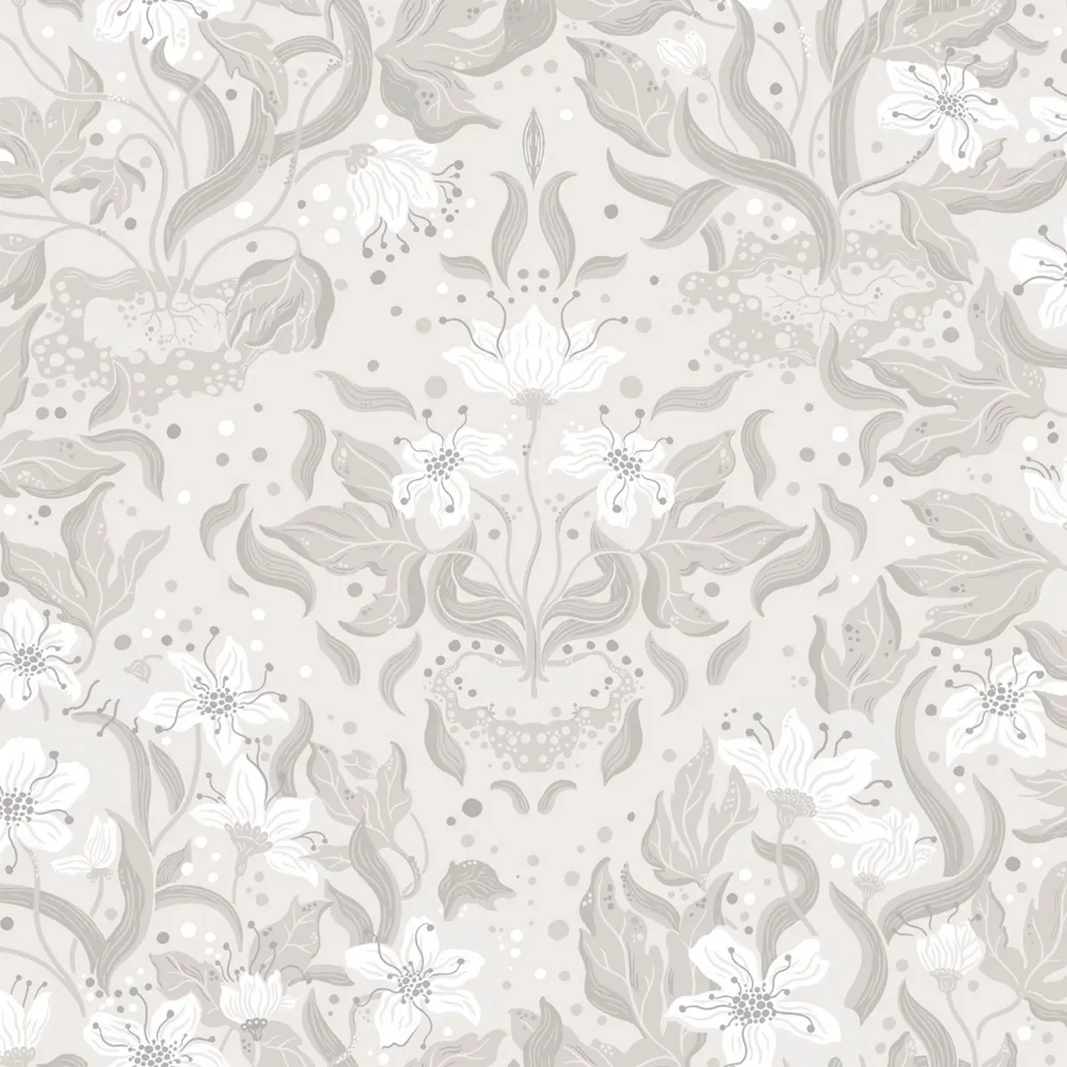 Ljusgrå tapet med vita blommor och grå blad mot en ljus botten.