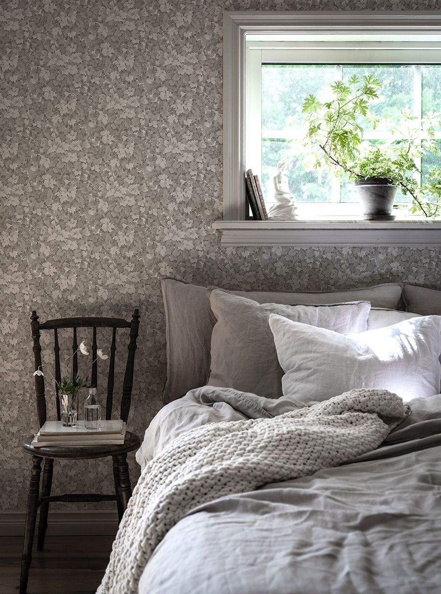 Lilla Dockekulla skapar en känsla av att vara omsluten av blad och natur. Tapetförlagan kommer från Beta gård i Åtvid, Östergötland. Mönstret är en tidigare favorit hos oss.