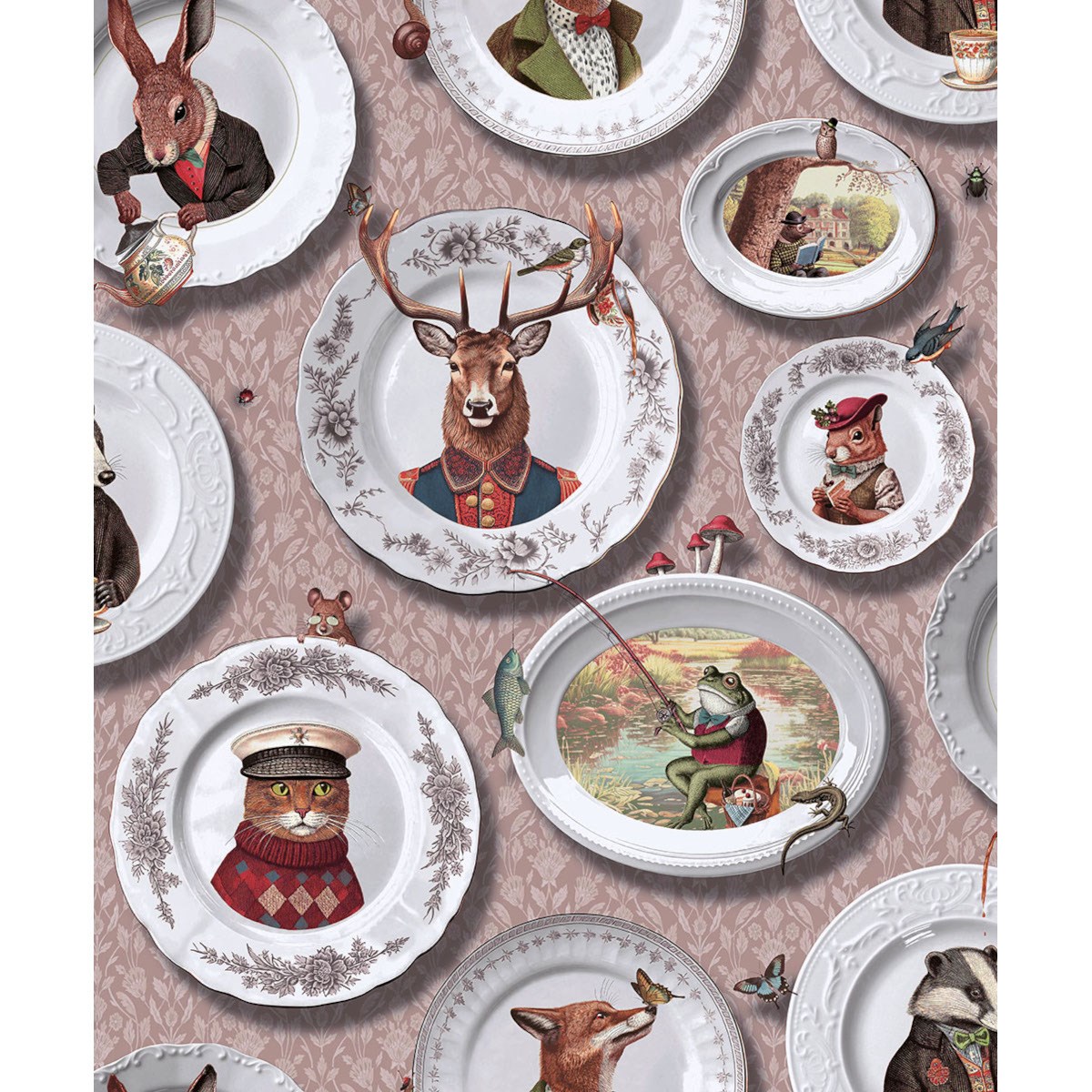 En lekfull, vintageinspirerad tapet med charmiga djur som ägnar sig åt fantasifulla aktiviteter såsom att dricka te, fiska och läsa. Mot en bakgrund av damastmönster skapas en mjuk och berättande känsla, där överraskande detaljer tillför både charm och lekfullhet.