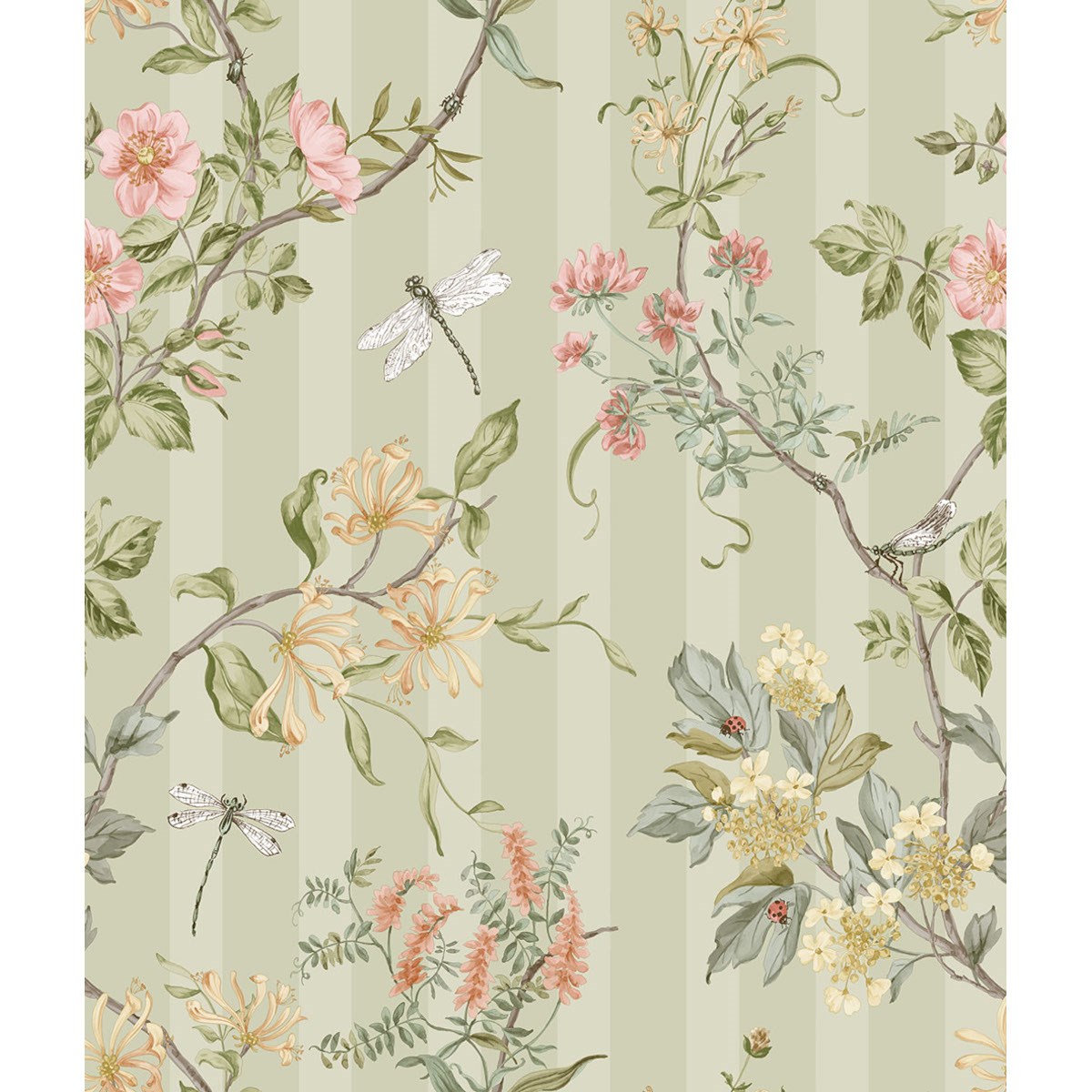 Ett elegant blommönster slingrar sig över en subtil randig bakgrund. Fina rankor vilar längs mjukt svepande grenar, där knoppar slår ut i blom, medan trollsländor svävar nära vårens blommor. Denna tapet passar perfekt i alla rum och skapar en rofylld atmosfär.