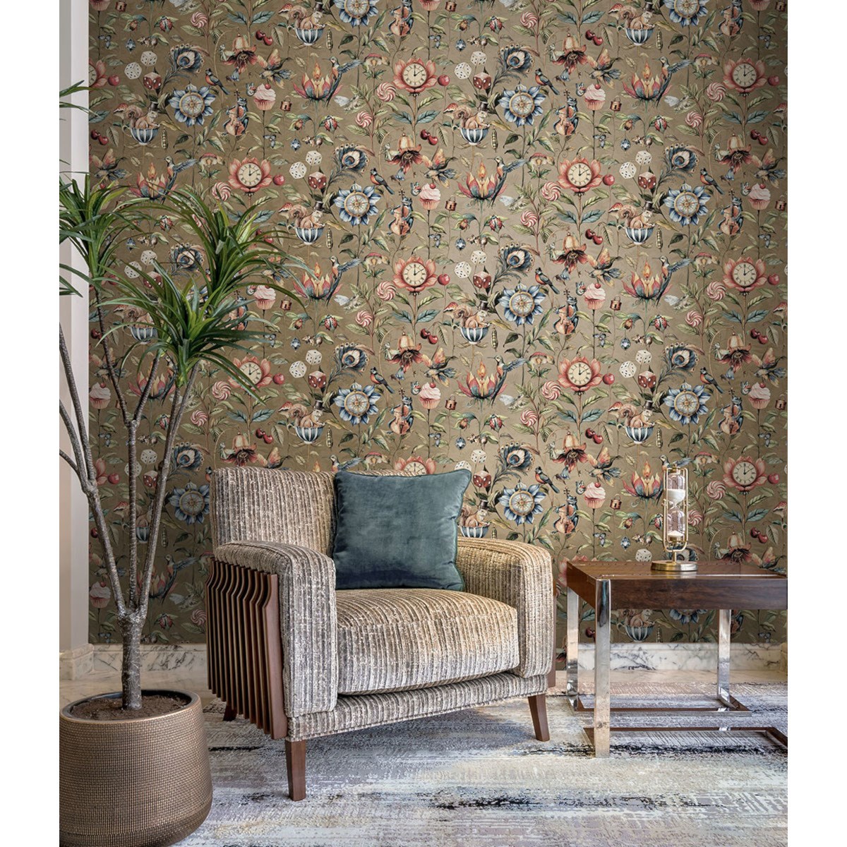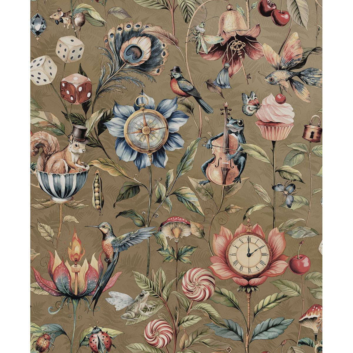 Ett fantasifullt mönster fyllt med en mix av djur och föremål, som väcker en surrealistisk sagovärld till liv. Färgsatt i juveltoner mot djärva bakgrunder skapar denna tapet en magisk atmosfär.