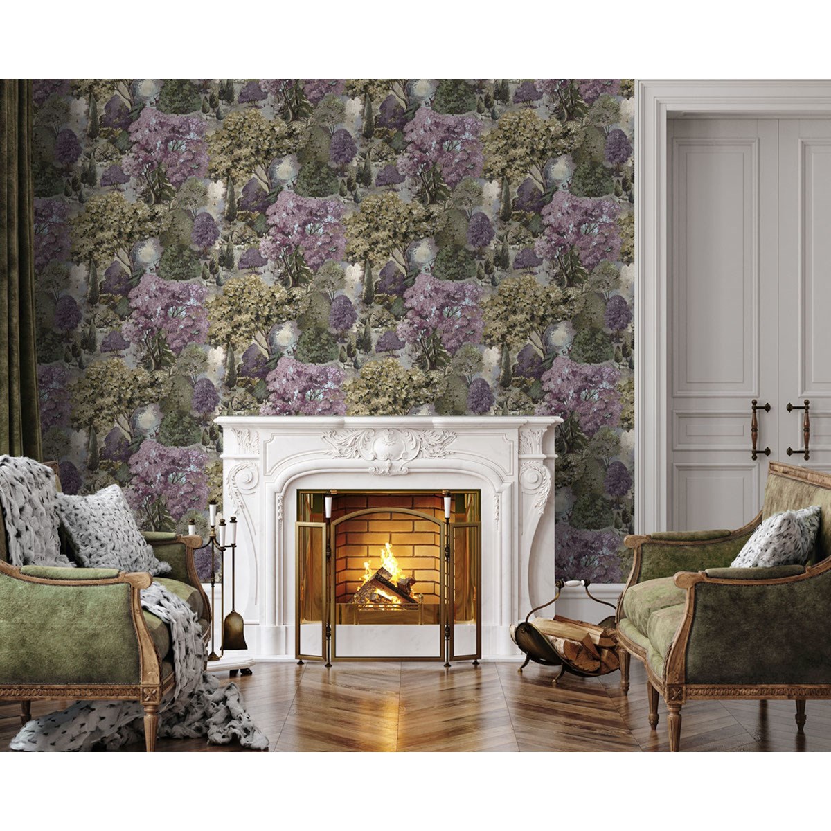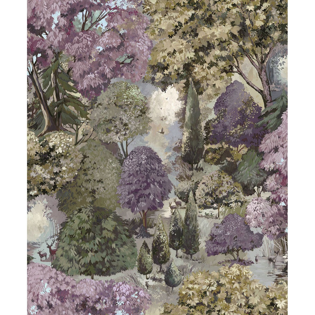 Detaljerade penseldrag ger textur till de natursköna skogsvyerna. Eleganta, höga träd, porlande bäckar och ljusinslag skapar en design med både djup och dimension.