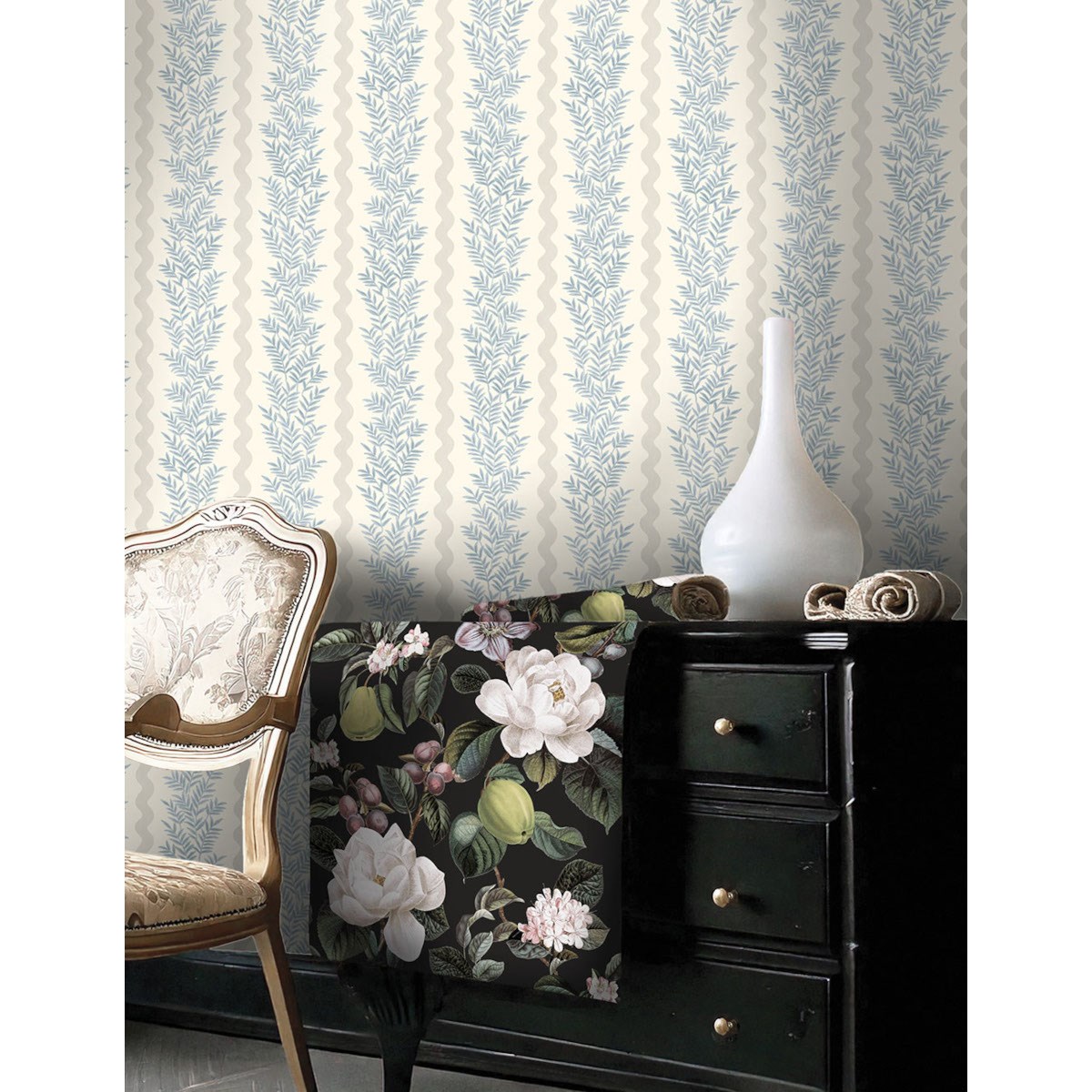 Pipkin Stripe kombinerar elegans och natur i en modern tolkning av ett klassiskt randigt mönster. Bladen skapar djup och intresse i den naturliga, svepande rörelsen hos växtligheten, inramad av mjuka vertikala vågor som ger struktur